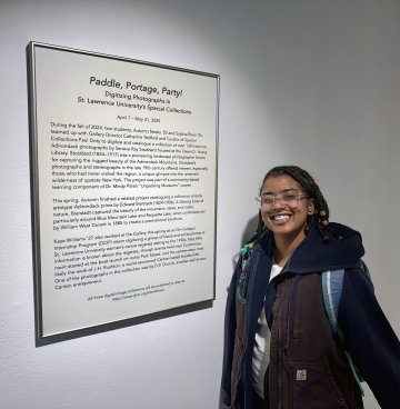 Kaya Williams ’27 also worked at the Gallery this spring as an On-Campus Internship Program (OCIP) intern digitizing a group of black-and-white photos of St. Lawrence University women’s canoe regattas dating to the 1930s. Very little information is known about the regattas, though events held near Commencement started at the boat launch on outer Park Street, and the canoes were most likely the work of J.H. Rushton, a world-renowned Canton-based boatbuilder. One of the photographs in the collection was by D.P. Church, another well-known Canton entrepreneur.