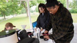 Sarath Novas sets up photography equipment in a gazebo in a park. They’re experimenting with pinhole cameras, which look like large boxes.