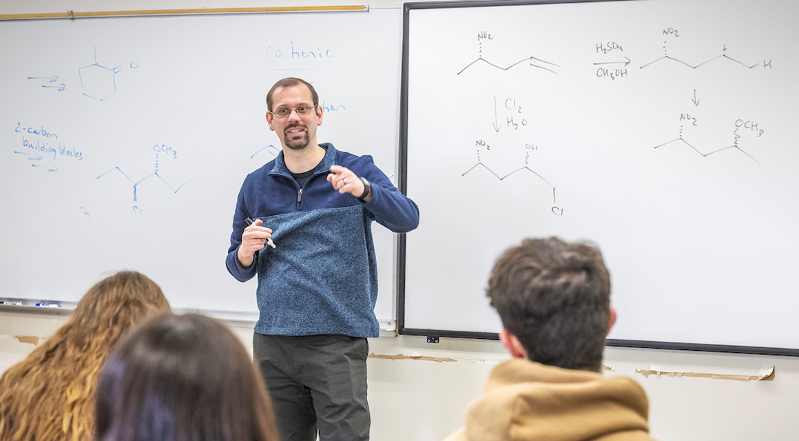 For many students, chemistry can seem daunting—but Associate Professor of Chemistry Sam Tartakoff is on a mission to change that. Whether through hands-on activities in General Chemistry or innovative grading systems in Organic Chemistry, he creates an environment where students don’t just memorize facts but discover the rules of chemistry for themselves.