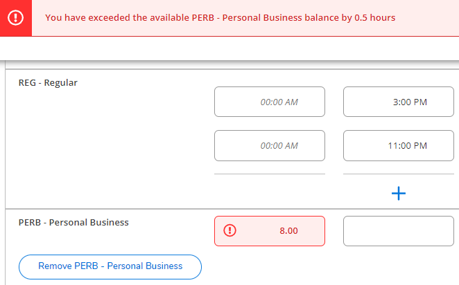 - You need to change the amount or Remove PERB – Personal Business, before the time card can be saved (automatically or by clicking the Save button).