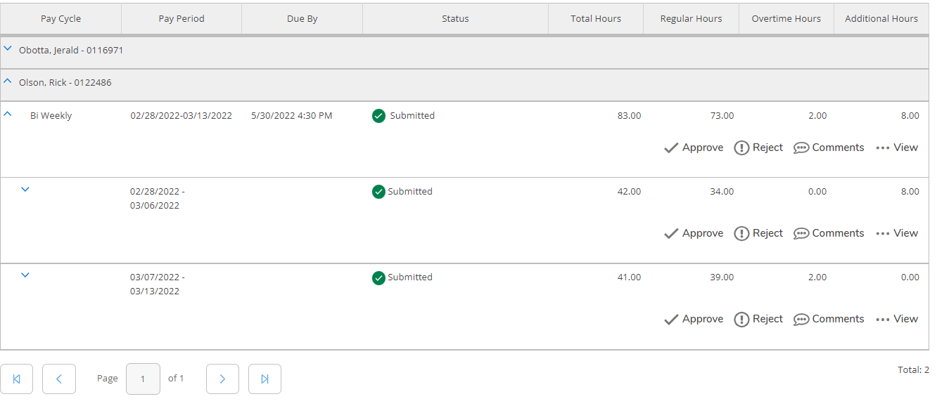 Note: The first view gives you the summary of the pay period status and hours. You can click on the down carrot next to the pay cycle (Bi Weekly) to view both weeks of the pay period.