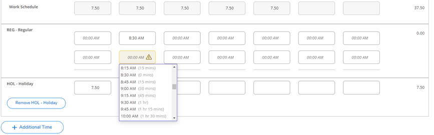 Vacation: Choose Vacation under the Additional Time and enter the hour(s).