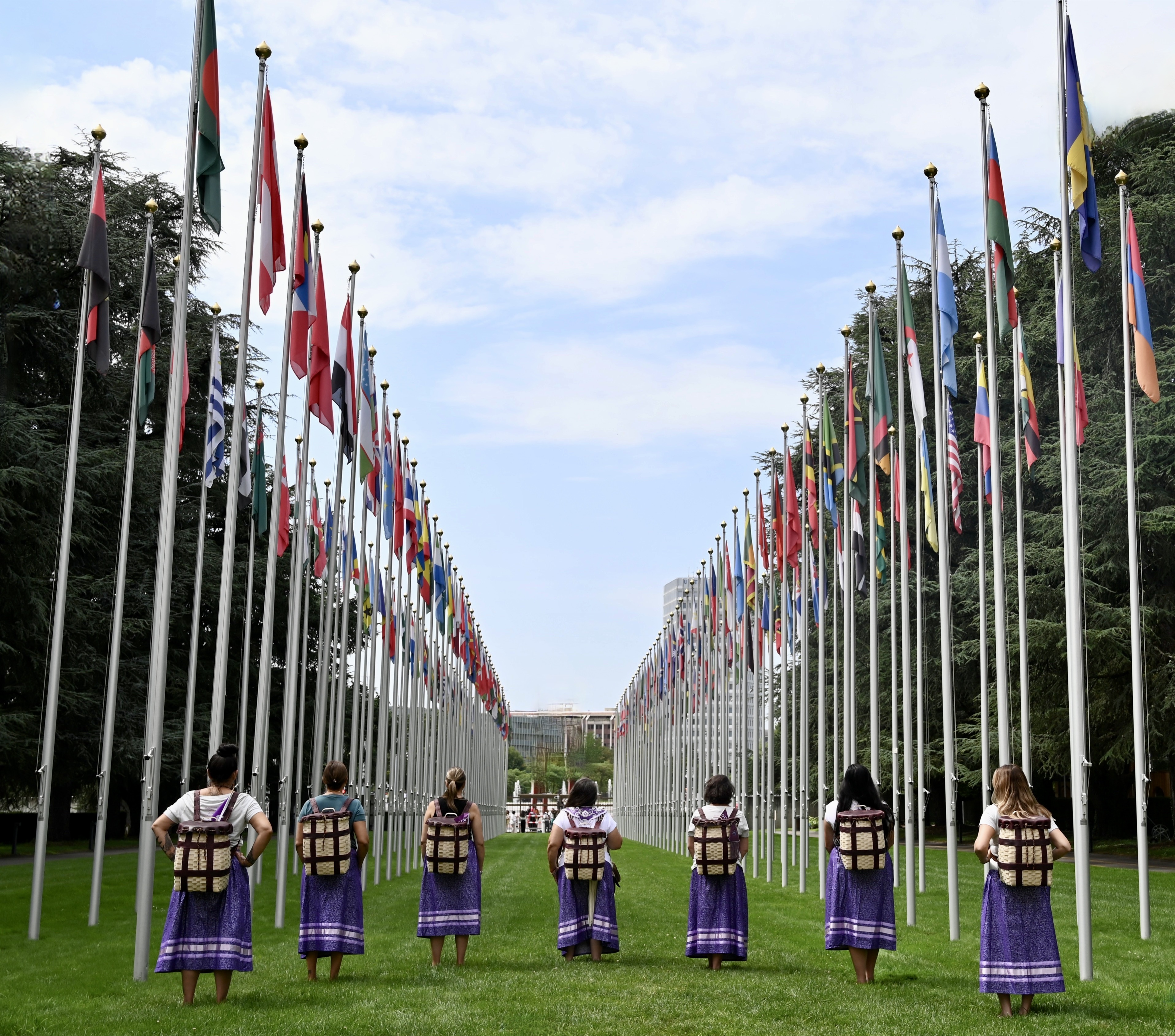 Image: Matrilineal Order of Haudenosaunee Women, photograph by Marjorie Kaniehtonkie Skidders. In the summer of 2023, a delegation of Haudenosaunee women traveled to Geneva, Switzerland, to support the Haudenosaunee External Relations Committee at the United Nations’ 16th session of the Expert Mechanism on the Rights of Indigenous Peoples (EMRIP). Easily identified by their splint backpacks and traditional ribbon skirts, they were looked upon as stalwart fighters of Indigenous human rights. Their presence at the event also commemorated the 100th anniversary of Deskaheh’s attempt to address the League of Nations in 1923.