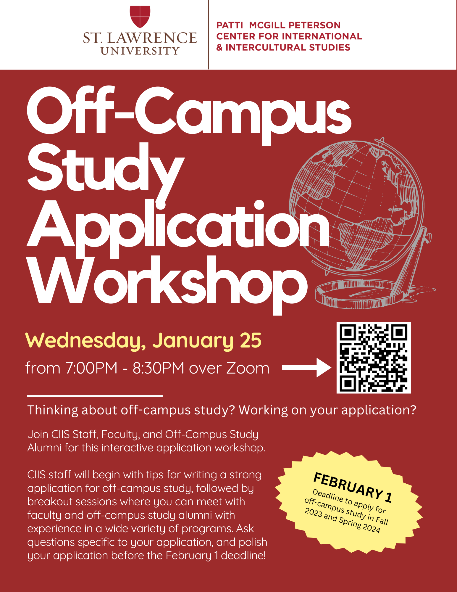 CIIS staff will begin with tips for writing a strong application for off-campus study, followed by breakout sessions where you can meet with faculty and off-campus study alumni with experience in a wide variety of programs. Ask questions specific to your application, and polish your application before the February 1 deadline!