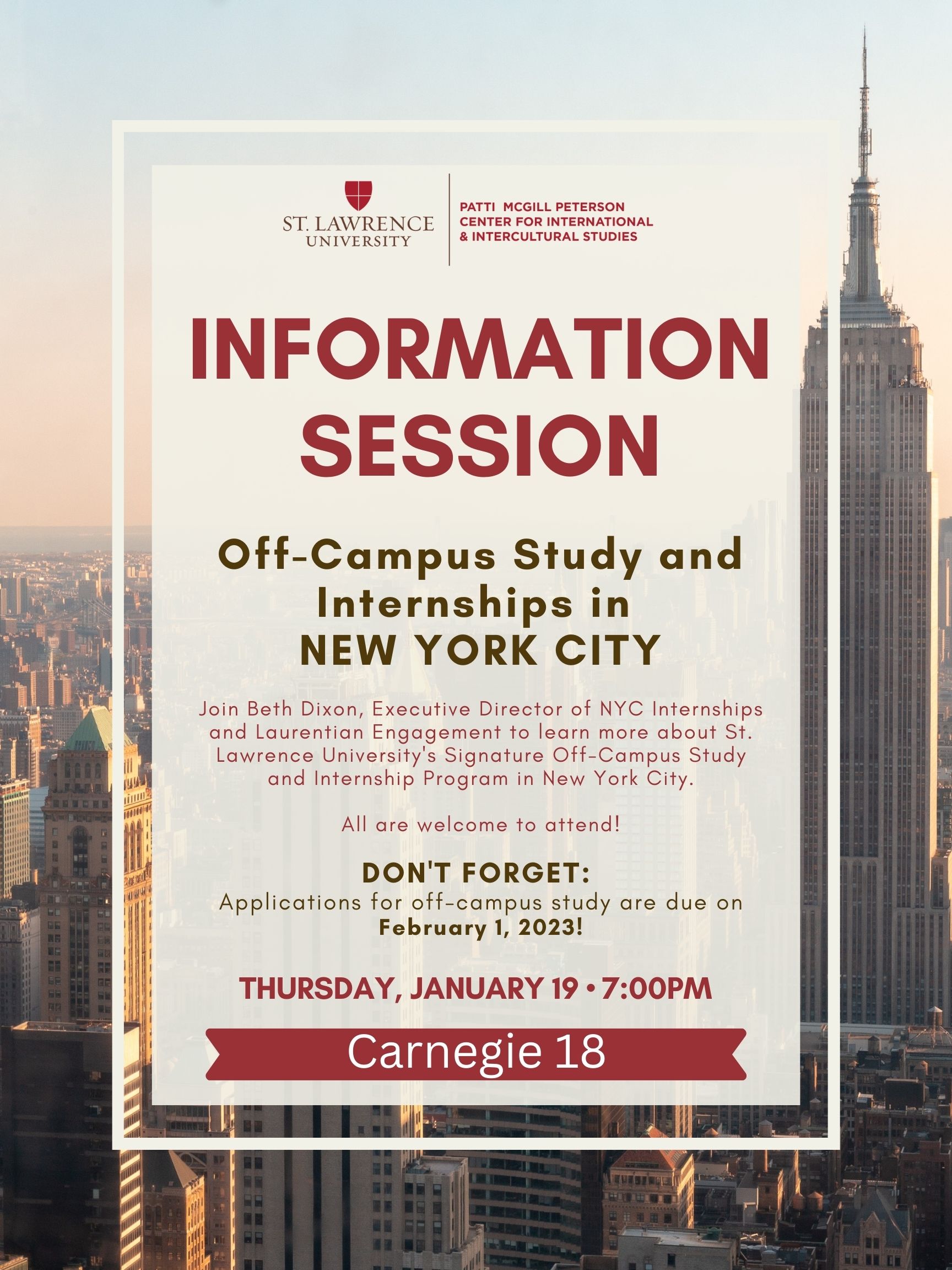Join Beth Dixon, Executive Director of NYC Internships and Laurentian Engagement to learn more about St. Lawrence University's Signature Off-Campus Study and Internship Program in New York City.