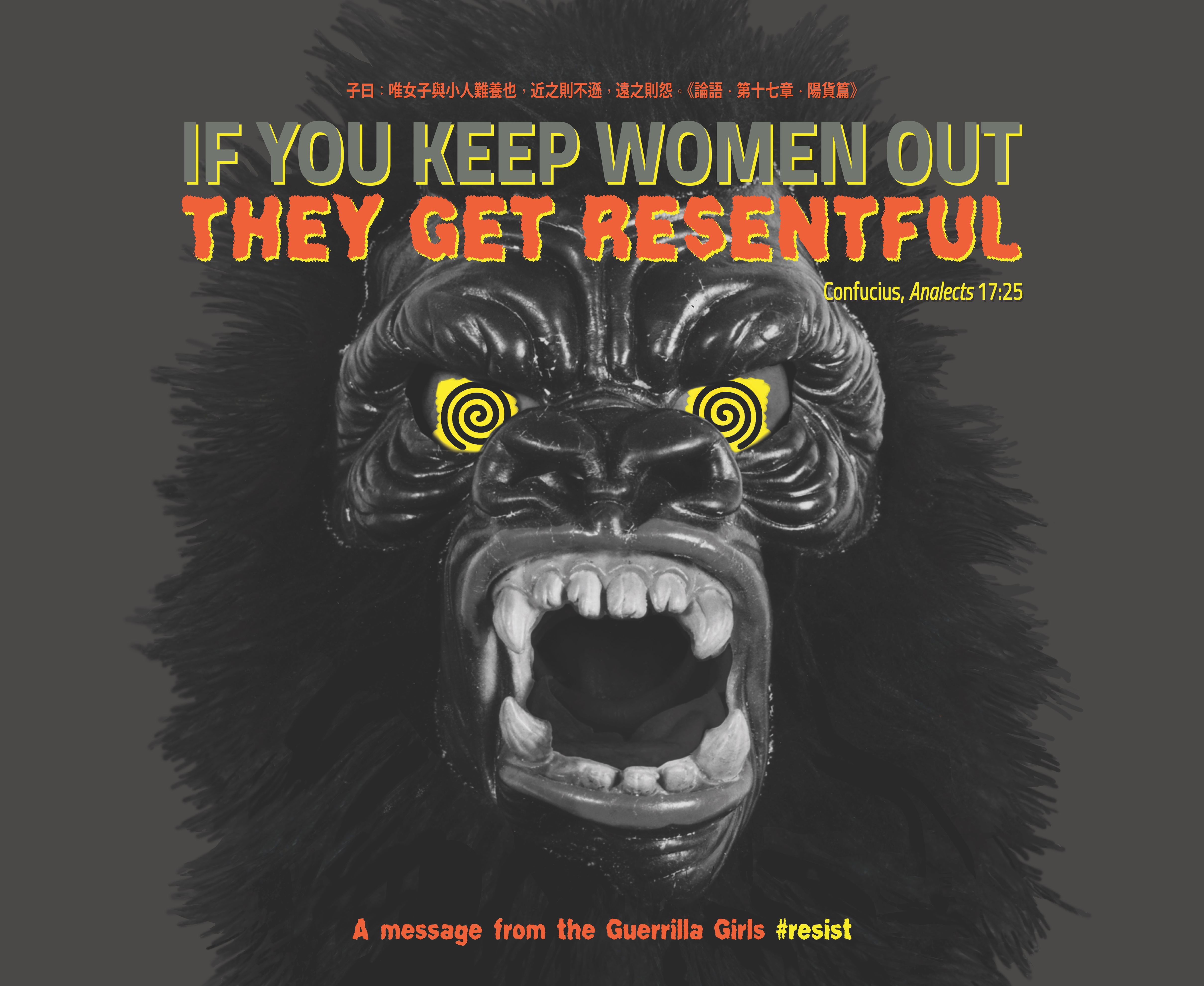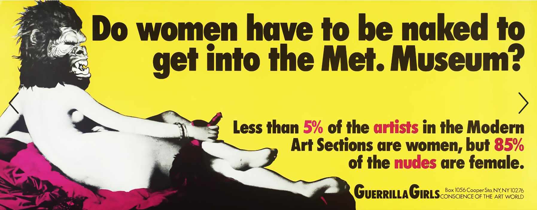[It’s the early 1980s in New York City.] Imagine you’re artists pissed off that almost all the opportunities in the artworld go to white men. Imagine you go to a protest outside the Museum of Modern Art after it opens an “international” exhibition in 1984 with 169 artists but only thirteen women and eight artists of color. You see immediately that no museum goer even cares! Imagine you have an “aha” moment and realize there HAS to be a better way – an in-your-face, unforgettable way – to break through people’s preconceptions and prove to them that the art system isn’t a meritocracy in which museums, galleries, critics, and collectors always know best.
