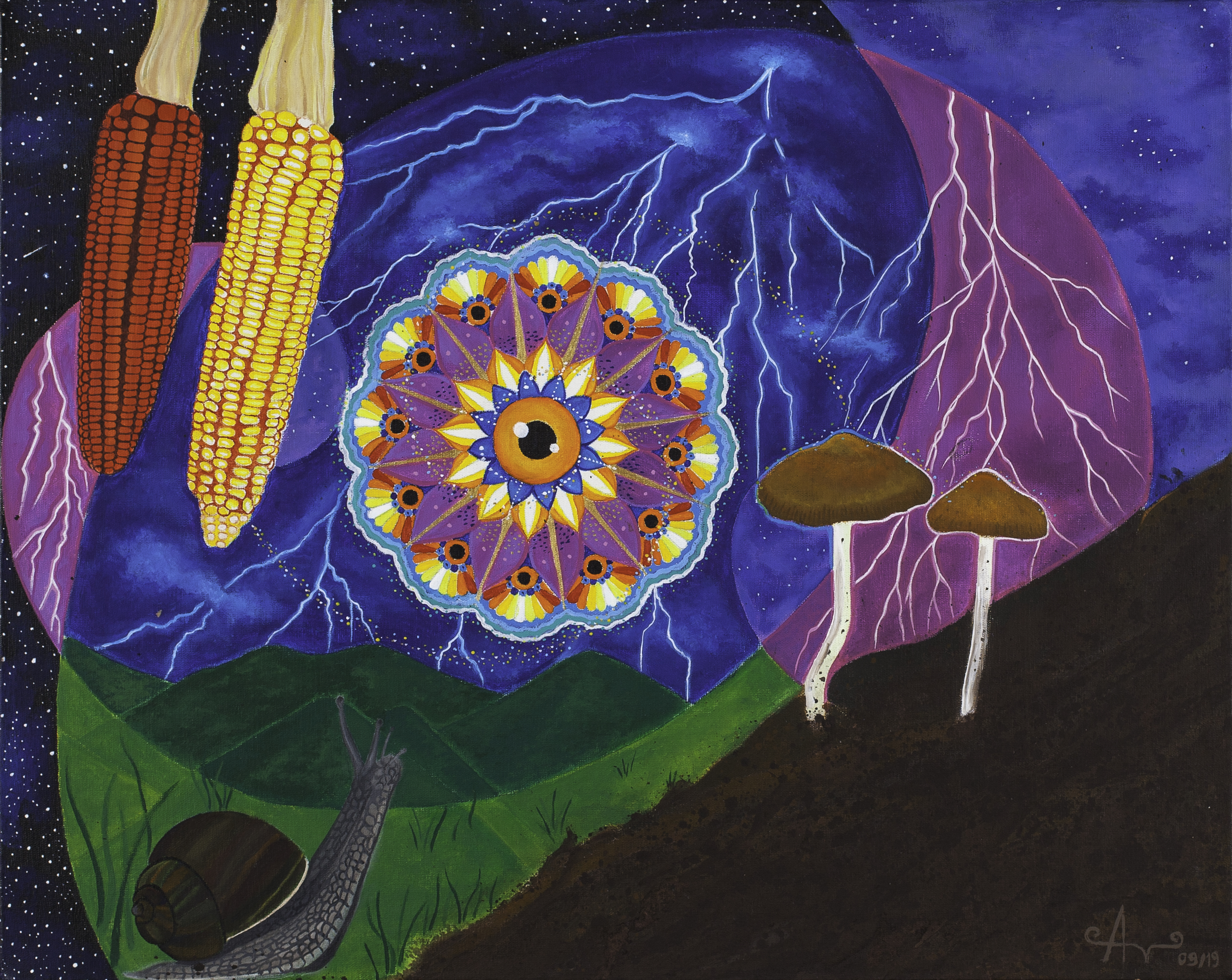 The exhibition brings together artworks and cultural artifacts from indigenous cultures around the world that reflect, like the Tibetan Buddhist vision, the shared wisdom and compassion that care for the Earth, our only home. A series of prints by featured Akwesasne artist, Katsitsionni Fox—on whose traditional Kanienʼkehá:ka (Mohawk) lands the mandala will be constructed—is accompanied by paintings, textiles, and ceramics from North America, South America, and India.
