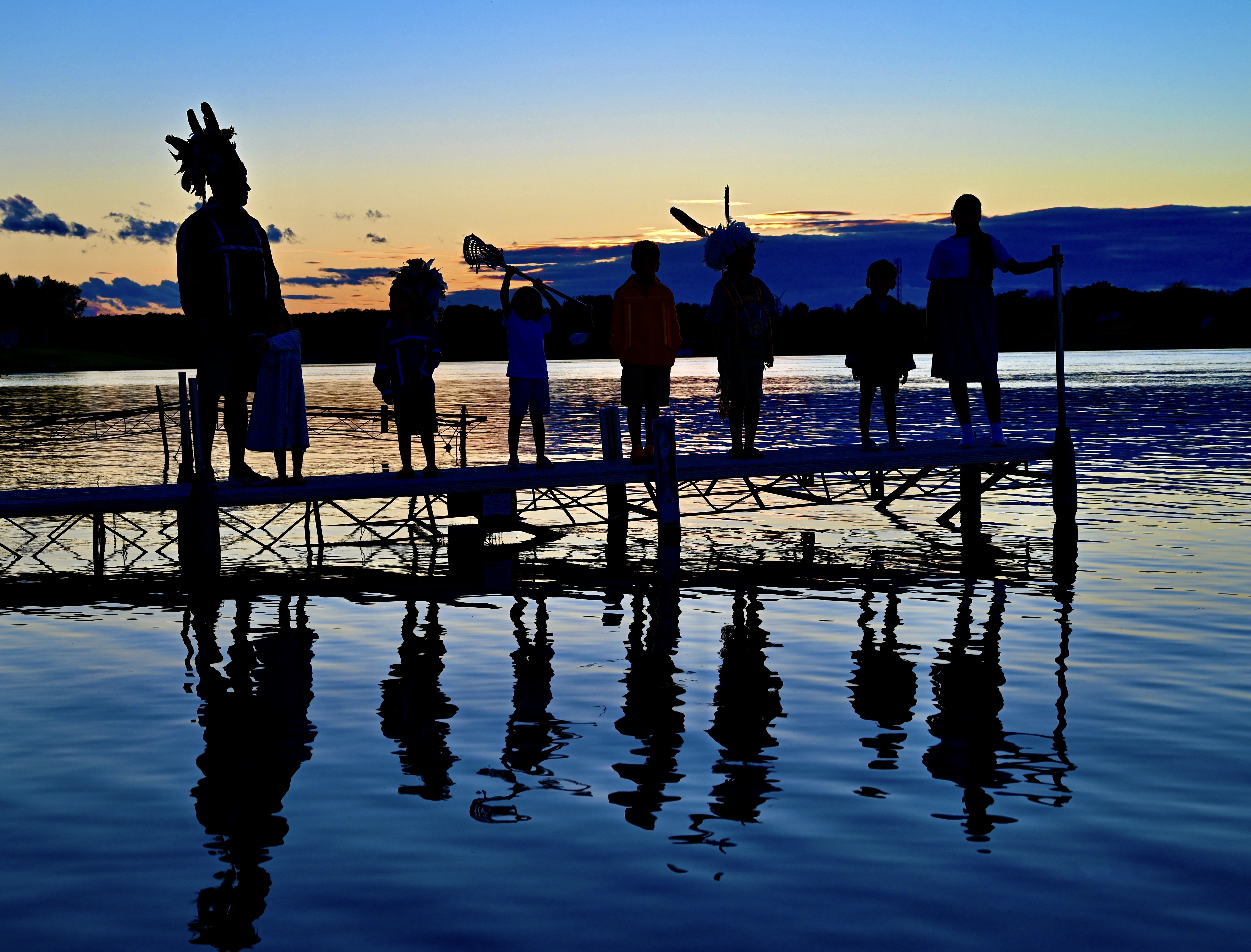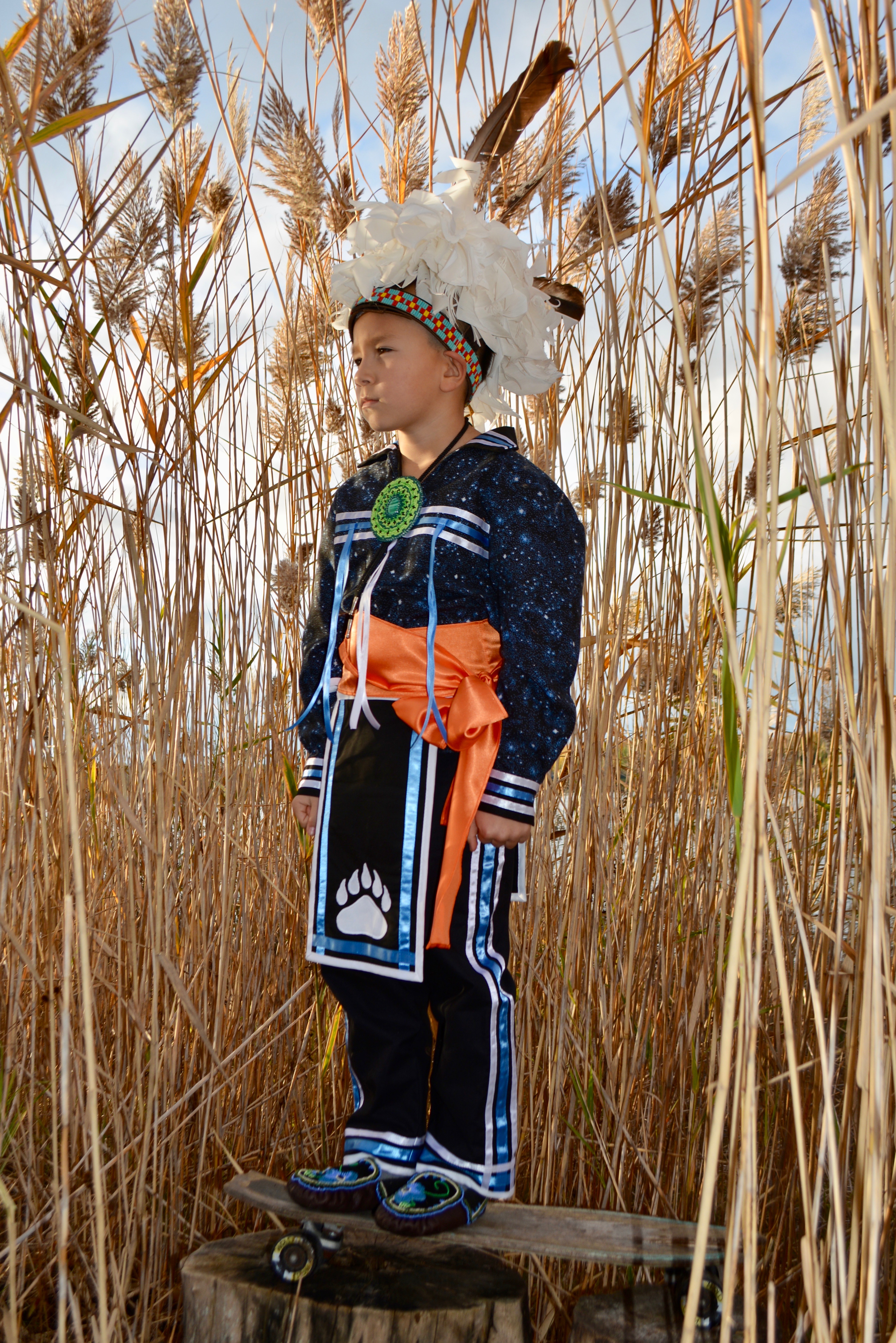 The photograph above is called Looking Into the Future, in which symbolism is everything. A young Akwesasne boy wears traditional clothing worn to special events and ceremonies at the longhouse. His breechcloth displays his clan symbol of a bear claw. He wears a kastowa with three feathers, immediately identifying him as Mohawk. He stands among invasive weeds representing the environmental degradation that has affected Mohawks for generations. His sash honors Indigenous children who suffered at residential schools—something his great-grandmother experienced in years past. His is the first generation not to be directly affected by such trauma. Looking forward, he stands on a skateboard — a youthful way to move into the future — strong and resilient.