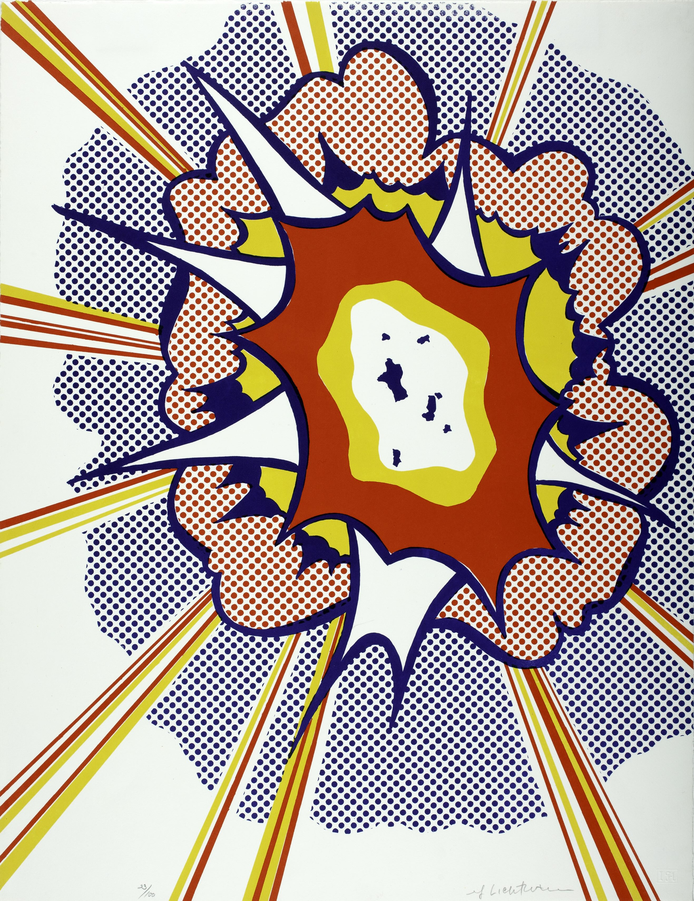Pop artists embraced the commonplace and the commercial, making popular culture their subject. Coke bottles, movie stars, celebrities, soup cans, comic book characters, and other icons of America’s secularism and materialism became tools to celebrate, mock, and sometimes indict the commercial exploitation and affluence that had overtaken American culture in the 1950s and ’60s. Lichtenstein’s print Explosion exemplifies the movement’s embrace of mass production and media imagery.