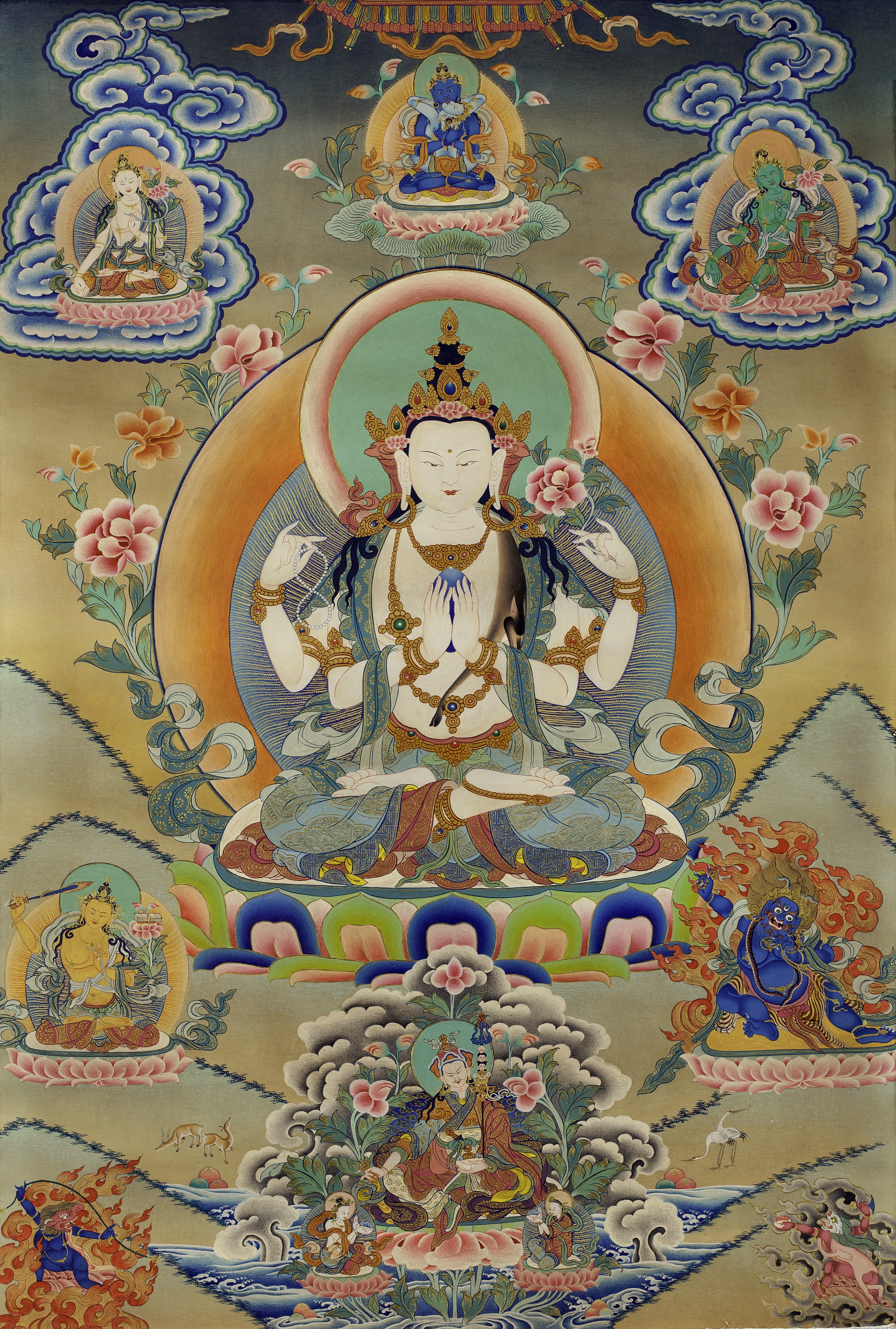 Chenrezig (in Sanskrit, Avalokiteśvara) personifies compassion, the most important ethical value in Buddhism. Many Buddhists, especially Tibetan Buddhists, perform a contemplative practice in which they visualize themselves as Chenrezig and imagine that in his form they are able to relieve the suffering of living beings throughout the cosmos.