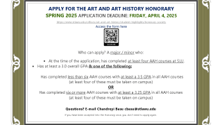The Art and Art History Honorary Society offers membership to students. Applications are solicited twice during the academic year and an induction ceremony takes place in the spring semester. A student may be accepted into the Honorary Society only once but once accepted need not apply again. The link to the application form can be found below.