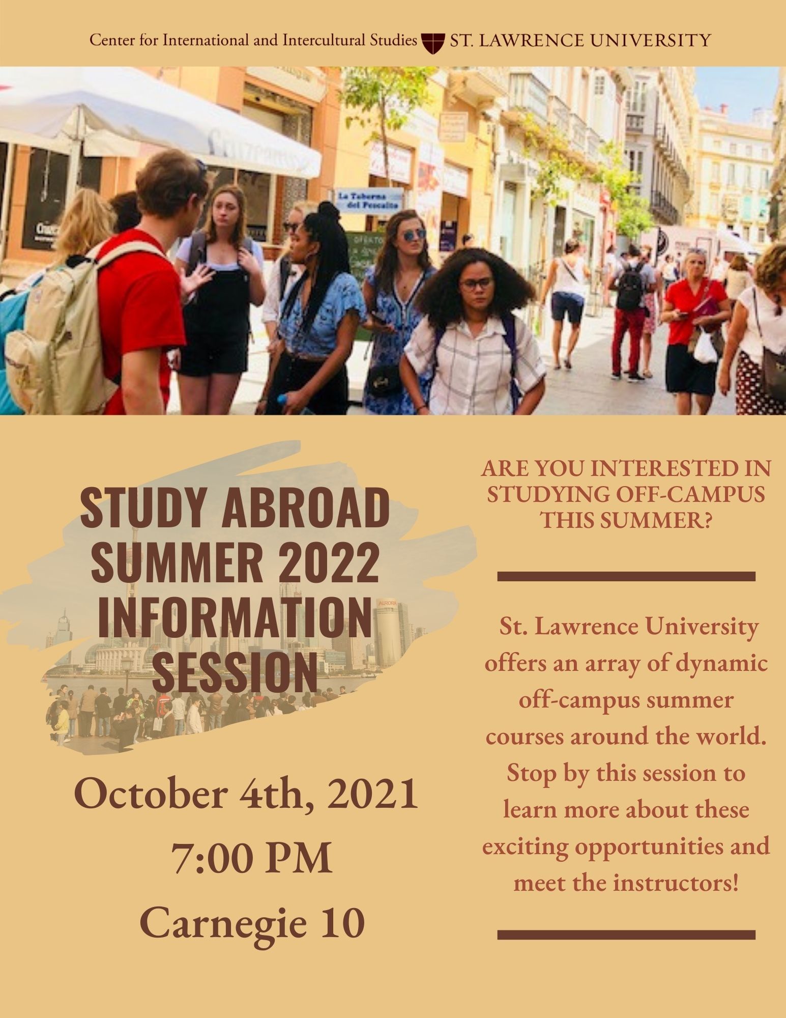 Please note: There will be a separate information session offered focusing on Summer 2022 courses offered in Kenya on Monday, October 4th at 12:00PM. During this session on Zoom, on-site staff from the Kenya Semester Program and St. Lawrence faculty will join to share more information about their courses.