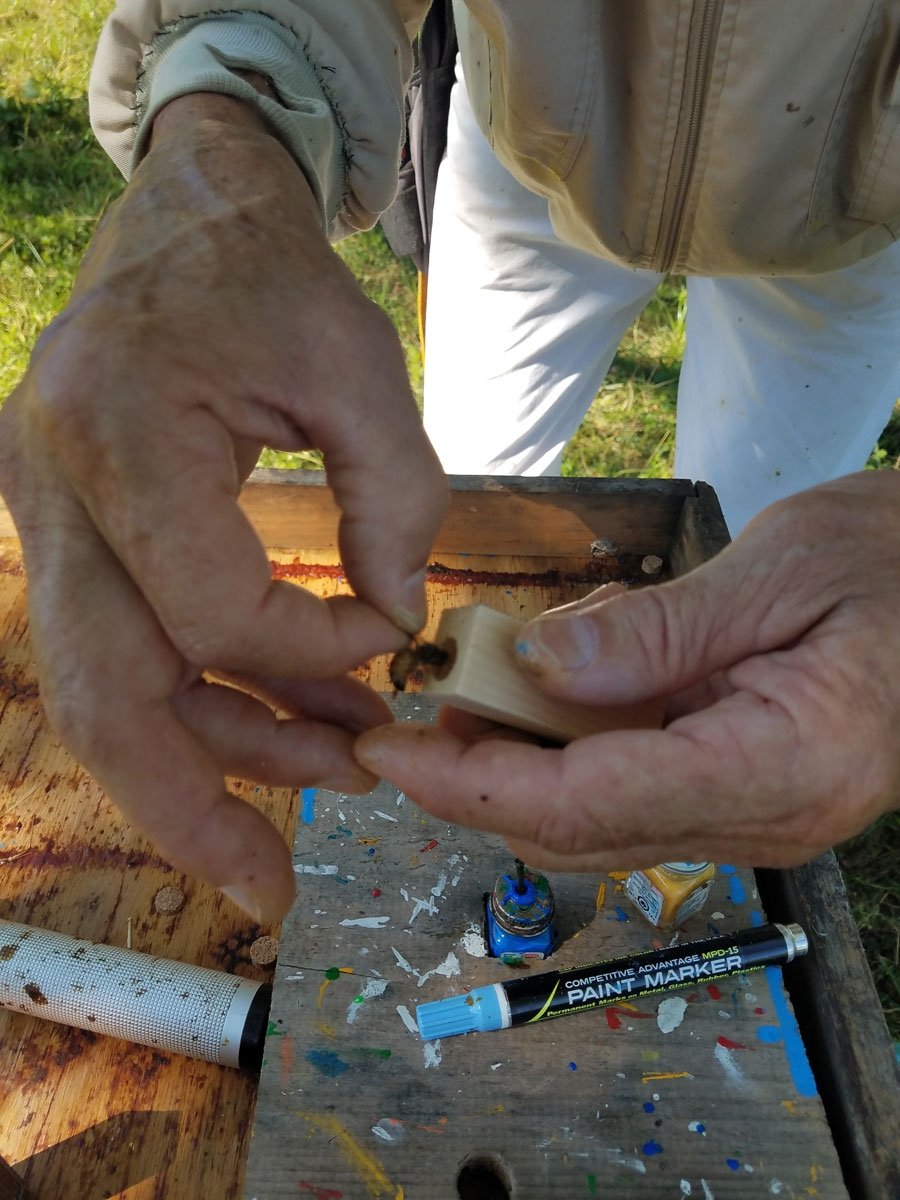 “We raise queens to sell, and when they’re ready to be sold, we have to go through the colonies and find them,” says Sarah, explaining that once the queens have been captured, Jack marks them with a small dot of paint on the thorax to make identifying them easier for their customers. The queens are secured in a small wooden cage with a few attendant bees and sealed with a candy plug before being overnighted to both commercial and hobby beekeepers fostering new colonies across the country.
