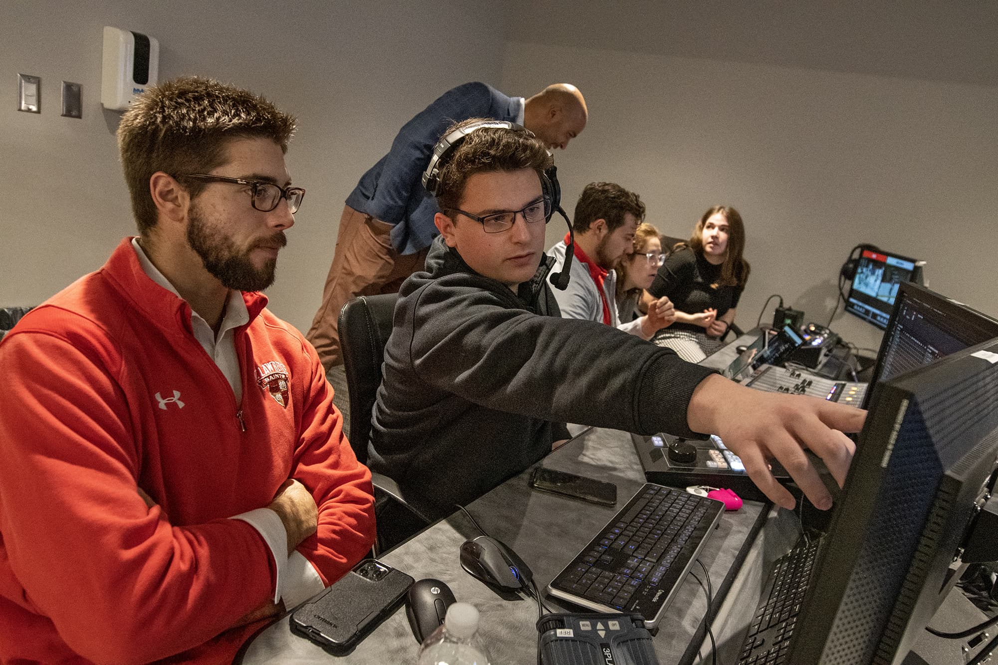 At any given moment in the booth, crew members—many of them current students—are pulling video clips for instant replays, coordinating which graphics should appear on the scoreboard, and keeping track of timing for the ESPN broadcast. Even in moments of chaos, they must work as a unit—counting down the remaining seconds in each period in unison and adjusting to quick changes with a cool head. Beyond the booth, at least three cameras capture the action in the arena.
