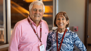 Bill and Jane Christ wearing scarlet and brown lanyards.