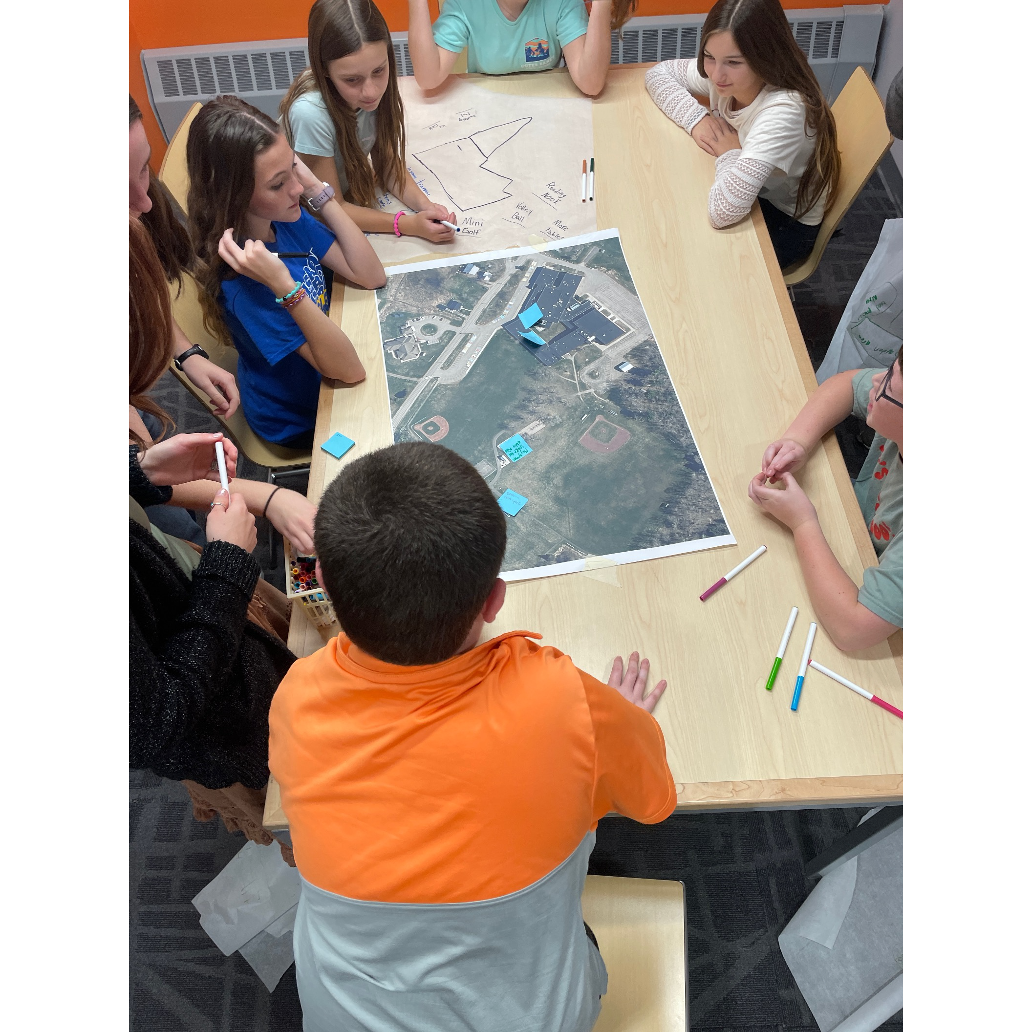 Throughout the fall semester Environmental Studies' faculty, Kearney Coupland's ENVS-3083, Environmental Psychology and Design, class worked with Lisbon Central School to come up with conceptual designs for the school’s courtyard. Students did a site analysis of the courtyard, conducted a survey and interviews with administration and teachers, and facilitated a design workshop for 6th-grade students in order to inform their designs. Using what they learned from their research with the school and based on environmental psychology concepts and theories, groups of students came up with some interesting and creative designs for the spaces that will be used for the school’s development of a proposal for the space in the future. In addition to designing an awesome new multi-functional space, the students had a great time working with Lisbon Central School and getting to engage with the surrounding communities.