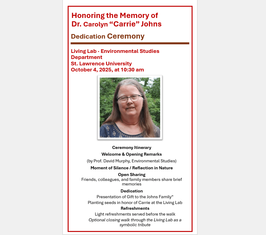 On October 4, 2025, the Environmental Studies Department at St. Lawrence University held a dedication ceremony at the Living Lab to honor the memory of Dr. Carolyn “Carrie” Johns. The event brought together close family, friends, and colleagues for a thoughtful remembrance of Carrie’s dedication to environmental education, community, and stewardship.