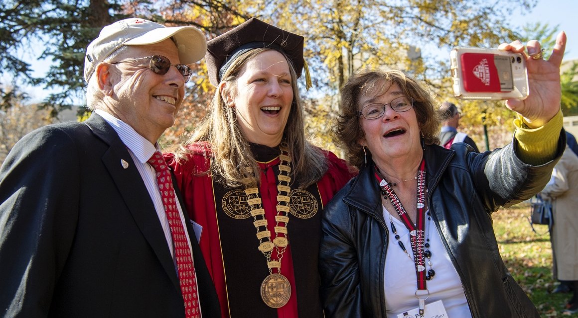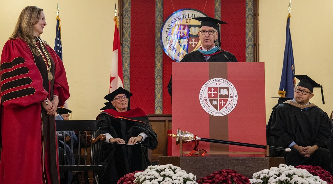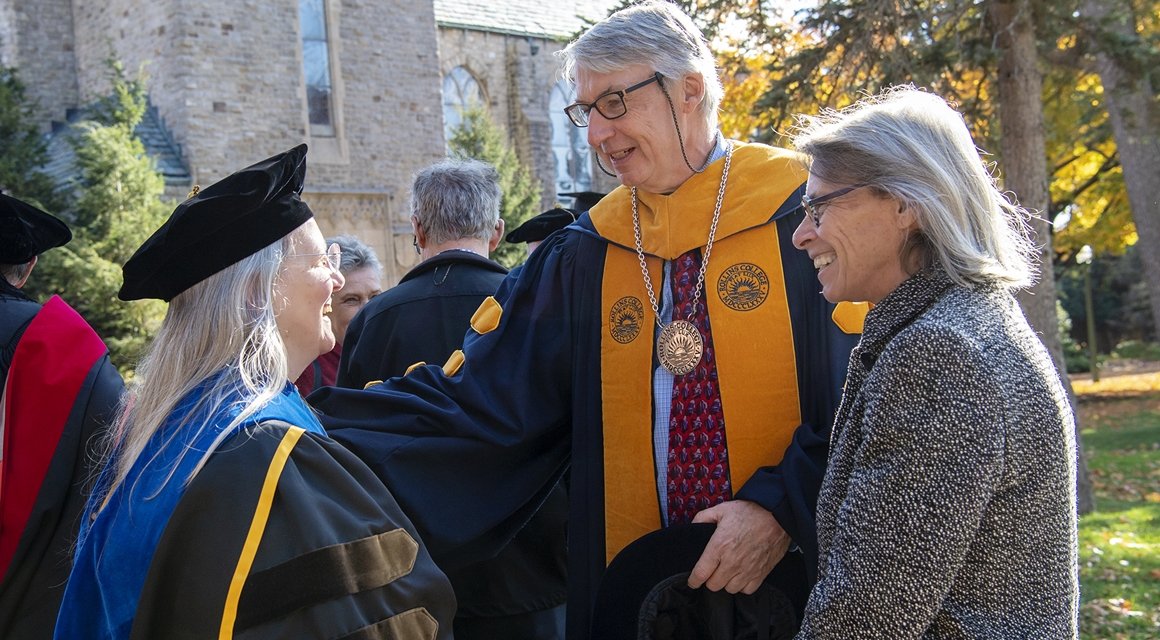 The inauguration ceremony began with an invocation by University Chaplain, The Rev. Dr. Shaun Whitehead, following a processional led by the Brockville Pipes and Drums and Fanfare, performed by Musician-in-Residence Sondra Goldsmith Proctor. The Laurentian Singers, a student a cappella group, performed three St. Lawrence songs, including Chapel Bells, A Tribute and Alma Mater. St. Lawrence Board of Trustees Chair Michael W. Ranger’80, ’P17, delivered the official welcome and presented the University Charter. Board Vice Chair and Chair-Elect Jennifer Curley Reichert ’90 presented the Presidential Medallion.