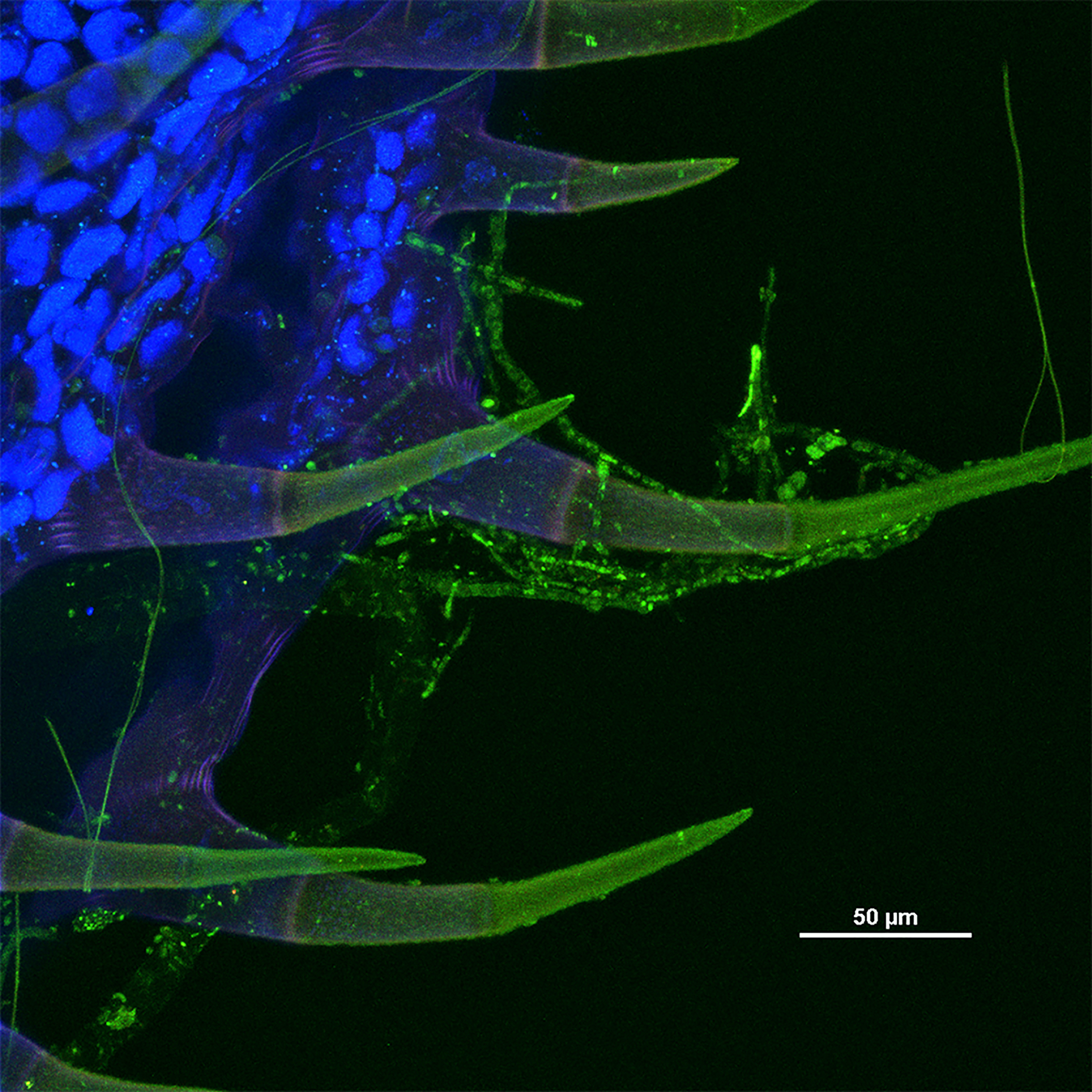 The Launders Science Library has teamed up with the Richard F. Brush Art Gallery to create a revolving display of stunning photographs in the library. Each semester, the St. Lawrence University community votes in an online poll to select their favorite confocal microscopy images created by students in Jill Pflugheber's Biology 392 Research Methods in Fluorescence and Confocal Microscopy class. All are welcome to come check out the students' favorite images!