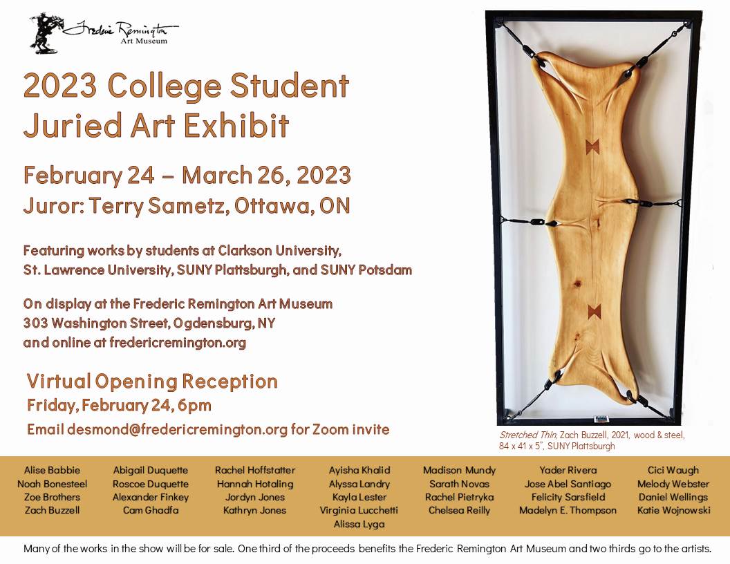 Four St Lawrence University students will have their work included in the 2023 College Student Juried Art Exhibit at the Frederic Remington Art Museum this Spring. An online Opening Reception will be held via Zoom on Friday, February 24 from 6:00 to 7:00pm. For more details, and an invite to join the Zoom event, contact Dr. Laura Desmond, Curator & Educator at the Museum.