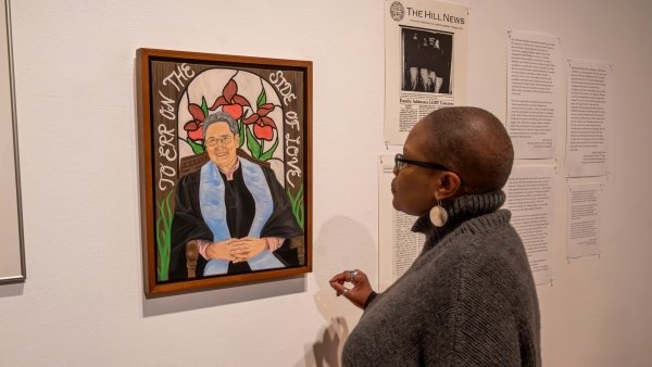 Reverend Kathleen Buckley (1953-2020) was a dedicated diversity advocate who served as University chaplain for nearly two decades. Buckley is remembered by many as a spiritual advisor, compassionate presence, and fierce advocate for LGBTQIA+ justice on campus. The Sullivan Center’s Reverend Kathleen Buckley Conference Room for Diversity & Inclusion, named in her memory, is a meeting space open to all students whose work aligns with Buckley’s inspired vision for the Laurentian community. Buckley’s portrait was painted by St. Lawrence student, Mikayla Quinn ’24, and is admired in this photo by Buckley’s partner, University Chaplain Rev. Shaun Whitehead.