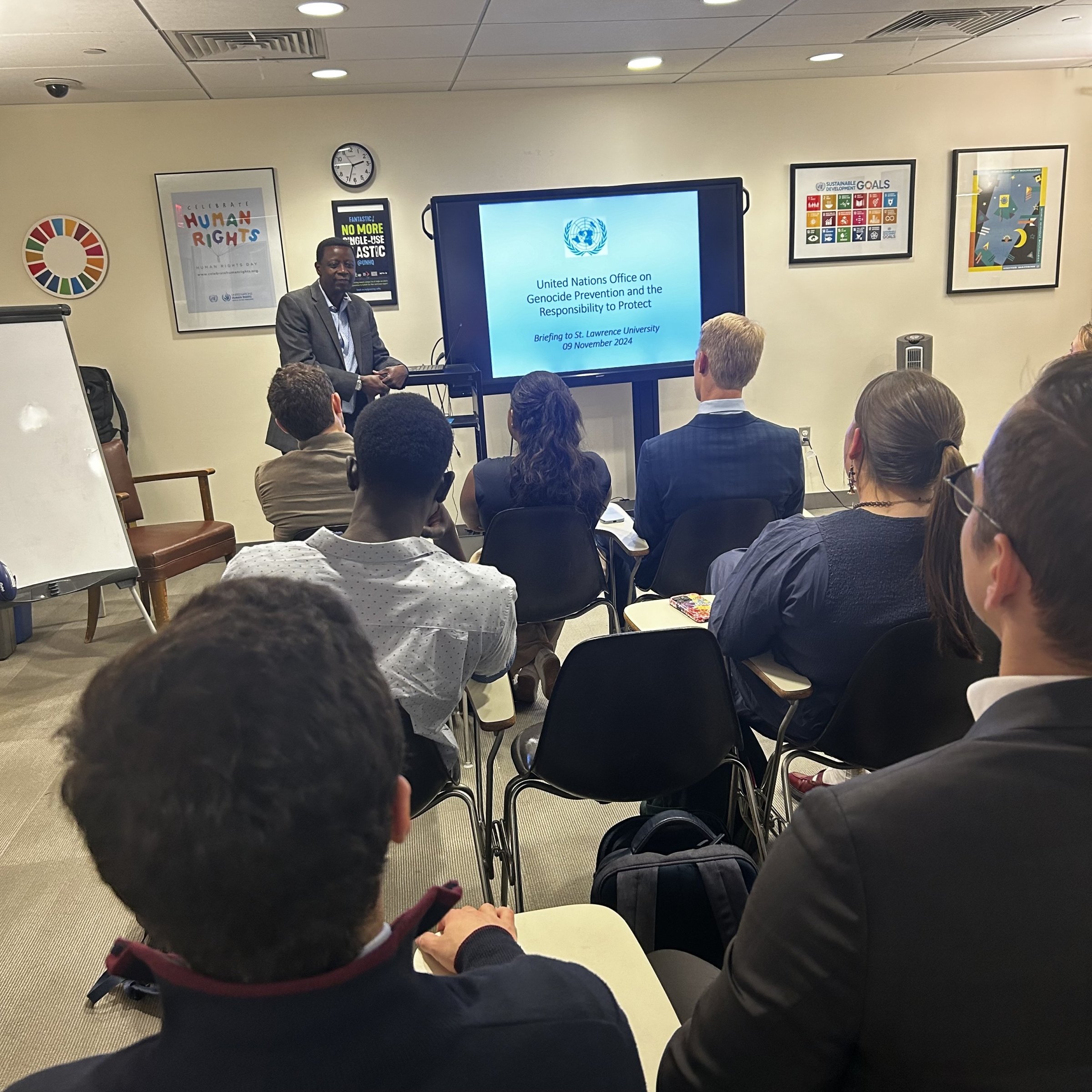 On November 8, 2024, 16 students from St. Lawrence University’s New York City (NYC) Semester Program, led by Dr. Mert Kartal (Associate Professor of Political Science), had the privilege of participating in an exclusive briefing session with the United Nations (UN) Office on Genocide Prevention and the Responsibility to Protect.