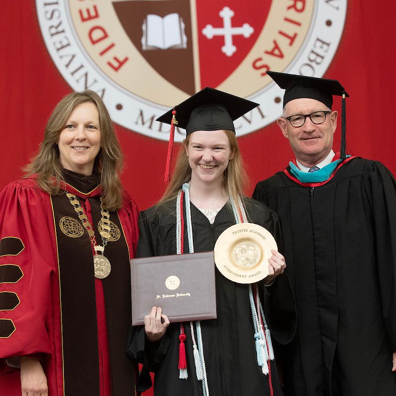 Senior Class President Grace Wagshul, a psychology major and education minor who is a member of both the Psi Chi honor society for psychology and the Chi Alpha Sigma student-athlete honor society, reflected on how learning at St. Lawrence—from the First-Year Program to senior seminars and honors projects, were “never just about the facts” but also about open-mindedness and thinking critically and creatively.