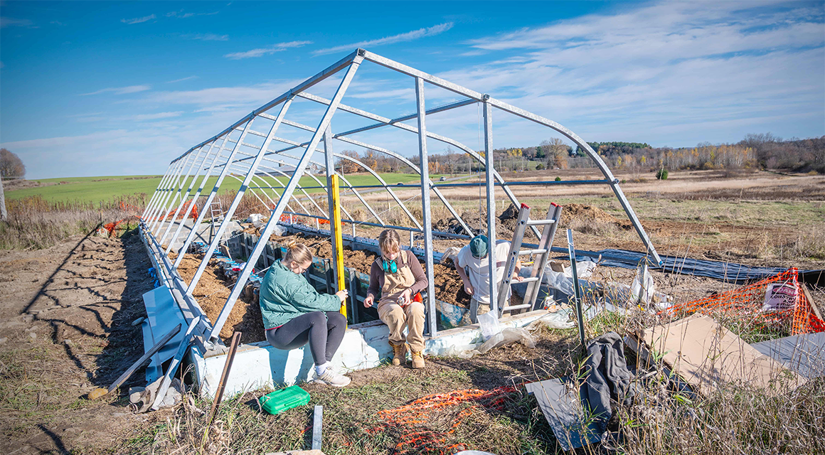 When it’s warm enough, Iverson says most students bike along the beautiful Saddlemire Trail—that connects St. Lawrence’s campus to local scenery such as the Little River, tall grass fields, and a horse pasture—in order to reach the Living Lab and begin work on the greenhouse.