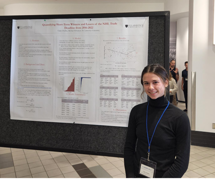 Who won the trade deadline is a frequent discussion for National Hockey League fans every spring. Recently Claire Dudley presented a poster on her senior honors thesis on estimating a short term answer to this question at the Cascadia Symposium on Statistics in Sports (CASSIS). CASSIS was held in September in Vancouver, BC and Claire’s advisor, Professor Michael Schuckers, also presented a talk at the conference.