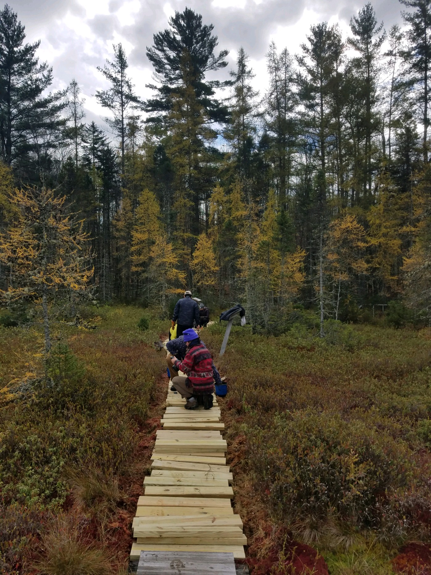 The Adirondack Semester trail work day had started earlier that Saturday morning with packing lunches and putting on our tattered work gloves and hiking boots. Then we Arcadians split into two groups. One group joined up with Peter Collinge, the head Massawepie trail crew volunteer, along the white trail leading towards the Four Points lean-to on the Massawepie property. The other group worked at the Massawepie Mire building boardwalks with Ben Geiger, Massawepie Scout Camps Ranger.