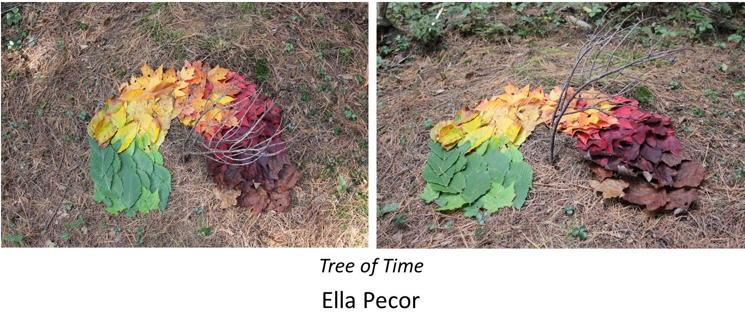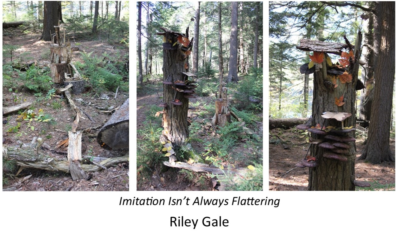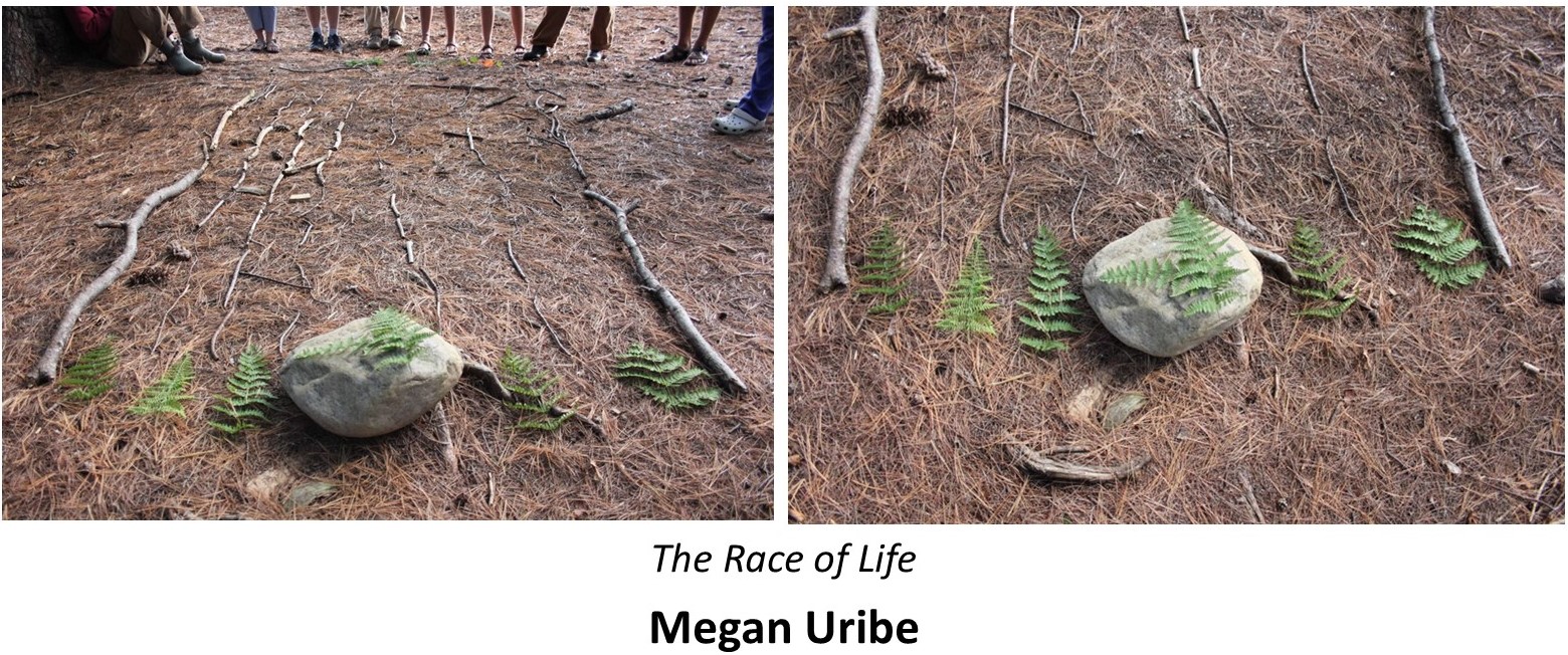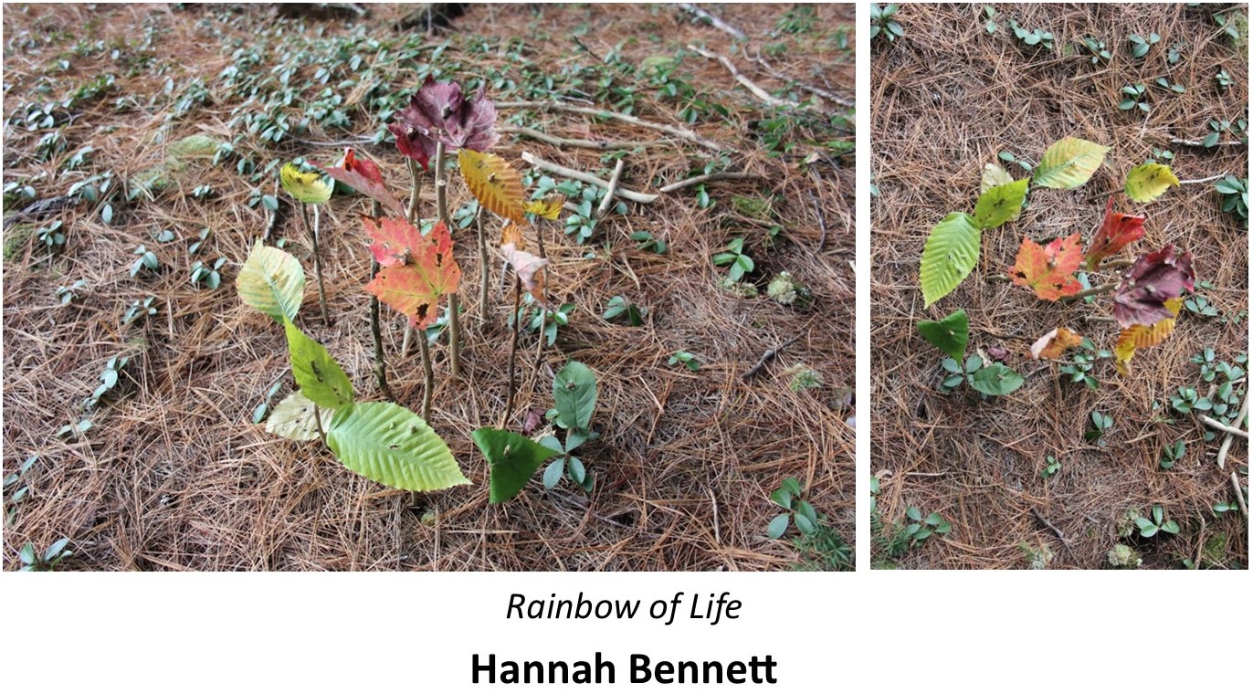 On the final day of a warm and sunny September, Professor Mark Sturges invited the Arcadians to build environmental sculptures out of found materials such as sticks, leaves, pine needles, and ferns. As part of their Writing the Adirondacks course, this assignment asks students to adopt the style and approach of environmental artist Andy Goldsworthy to create a visually appealing and meaningful sculpture, the design of which grows organically from the landscape of Massawepie and the outdoor experience of the semester. Many students constructed their sculptures as commentaries on human-nature relationships and connected their works to the personal and academic journey they are currently taking together. You can view these Arcadian artworks in the photos below.