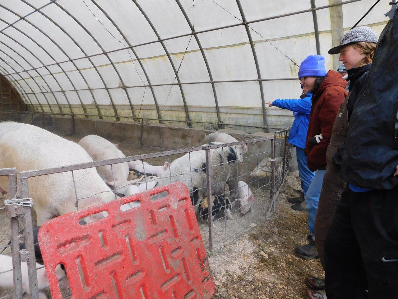 Mace Chasm Farm also works with cattle but for a very different purpose—here the animals are raised for meat. Along with cows, they also raise chickens, turkeys, and pigs. We were welcomed by Asa Thomas-Trainer, farm owner and leader of the five-person butchering team. One of the things that makes Mace Chasm unique is that the entire process, from the birth of the animals to their transformation into saleable meat products, is all conducted on site. Every aspect of the animals’ life cycle plays an important role in the farm ecosystem. Asa rotates where the livestock graze each day. The animals’ manure goes into the soil and fertilizes the grass that the other animals will eventually consume. Once the livestock have reached the proper size, they are slaughtered and then butchered in the on-site butcher shop. Finally, the unusable parts are composted and eventually spread across the pastures to enrich the soil as well.