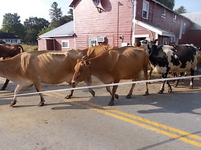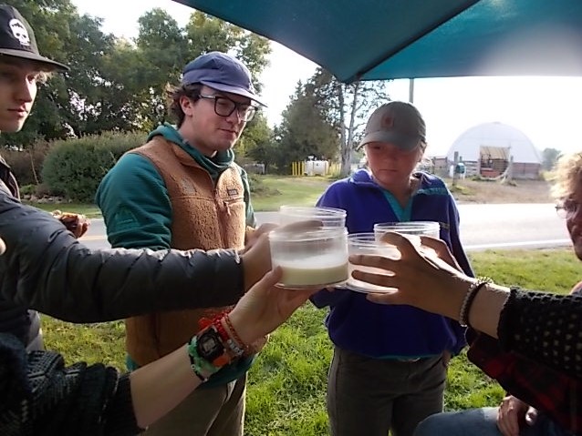 We enjoyed a breakfast of yogurt, granola, and delicious pastries. Ashlee gifted us fresh, warm milk from that morning’s milking to complement the meal. We raised a toast to the cows, thanking them for their labor. As we brought our Nalgene containers full of milk to our lips, Steven began to guide the cows across the road, bringing them back to their pasture. We excitedly stood up to watch, noting all the cows’ names written on their ear tags as they passed; Mocha, Jade, and Vicki were among our favorites. Callie recognized Fritter from the barn and identified her as the best cow. “Holy cow!” exclaimed Ben as the bovines reached the other side of the road. Soon we followed the cows, making our way through the tall grass to the pasture.