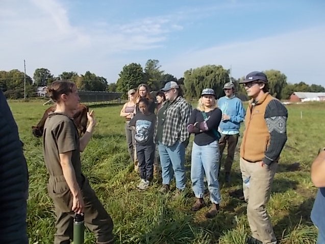 We also buy our dairy and meat products from small Adirondack farms, some of which we visited this past weekend on a field trip to Essex County in the eastern part of the Adirondack Park. We get our yogurt from North Country Creamery, a local dairy farm in Keeseville, NY, run by a young couple. We met the owners Ashlee Kleinhammer and Steven Googin who gave us a detailed tour of their facilities. Our introduction to the farm began before breakfast with a behind-the-scenes look into the milking process. As we walked into the barn, we were met with a series of clicks and the general whirring of machinery, an environment different from what we were expecting. North Country Creamery switched over to a mechanical system in 2020 after spending seven years milking by hand. This new system suctions in short intervals to imitate the way a calf drinks milk from the utter. From the cow, the suction carries the milk up piping into a 300-gallon collection tank. Despite the scent of cow permeating the barn, the idea of fresh milk carried us to the farmstand for breakfast.