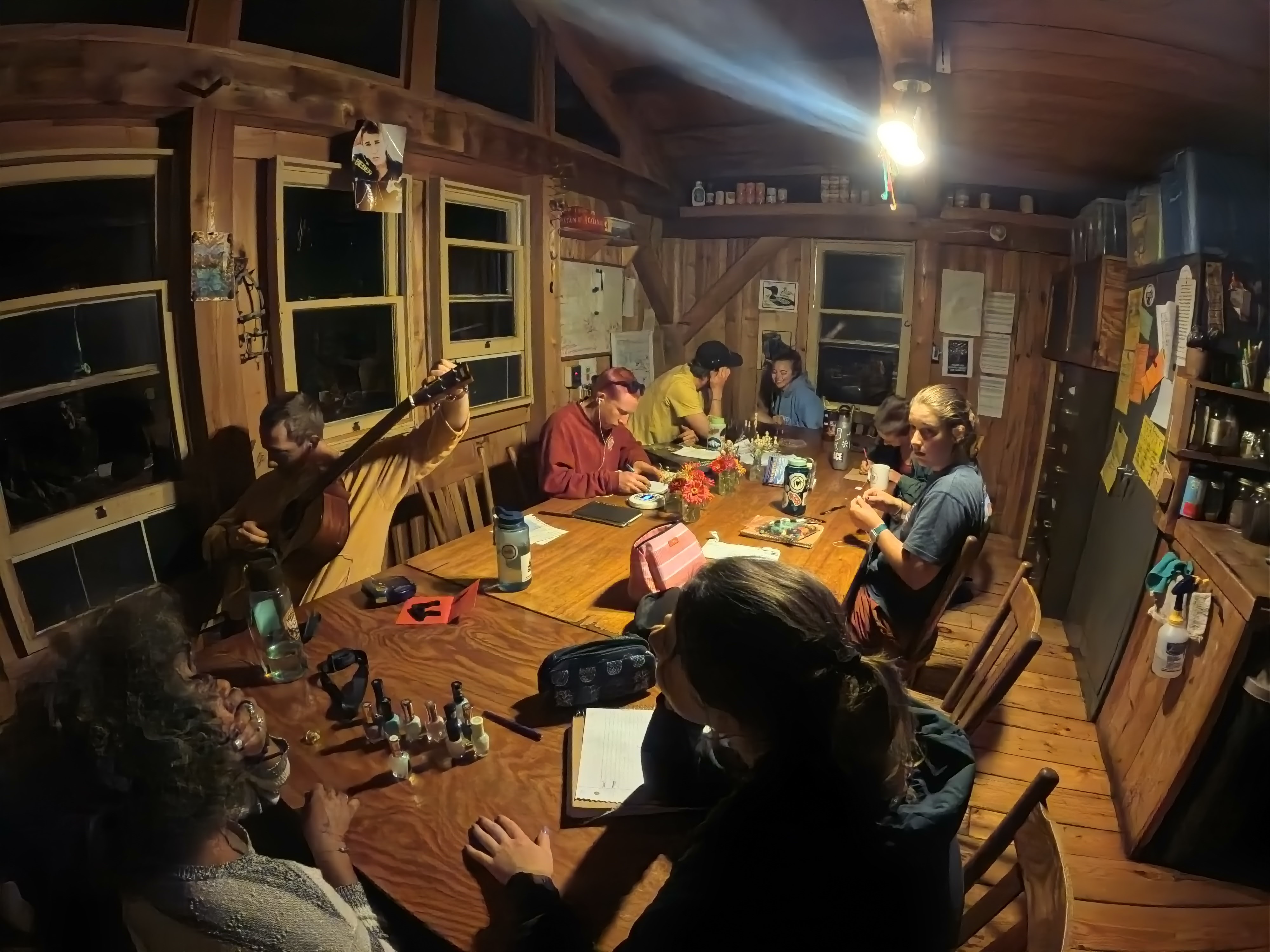 As night falls over Lake Massawepie, the daytime critters of the forest cozy up in their homes, and nearby in the yurt village, the Arcadians cozy up in the kitchen. They spend their final hours before bed hunched over a chessboard deliberating their next move, writing letters, listening to CDs, and laughing between yawns. Fellow Arcadian Keegan Leboffe will grab his guitar and lightly strum, spurring a soft chorus of singing from the rest of the group. This is what living simply looks like. Without cellphones, we check our watches for the time, Nate for the weather, and the Tupper Lake Library computers for news every other Thursday. Free from the constant grip of our devices, we can laugh loudly, breathe easily, and live fully.