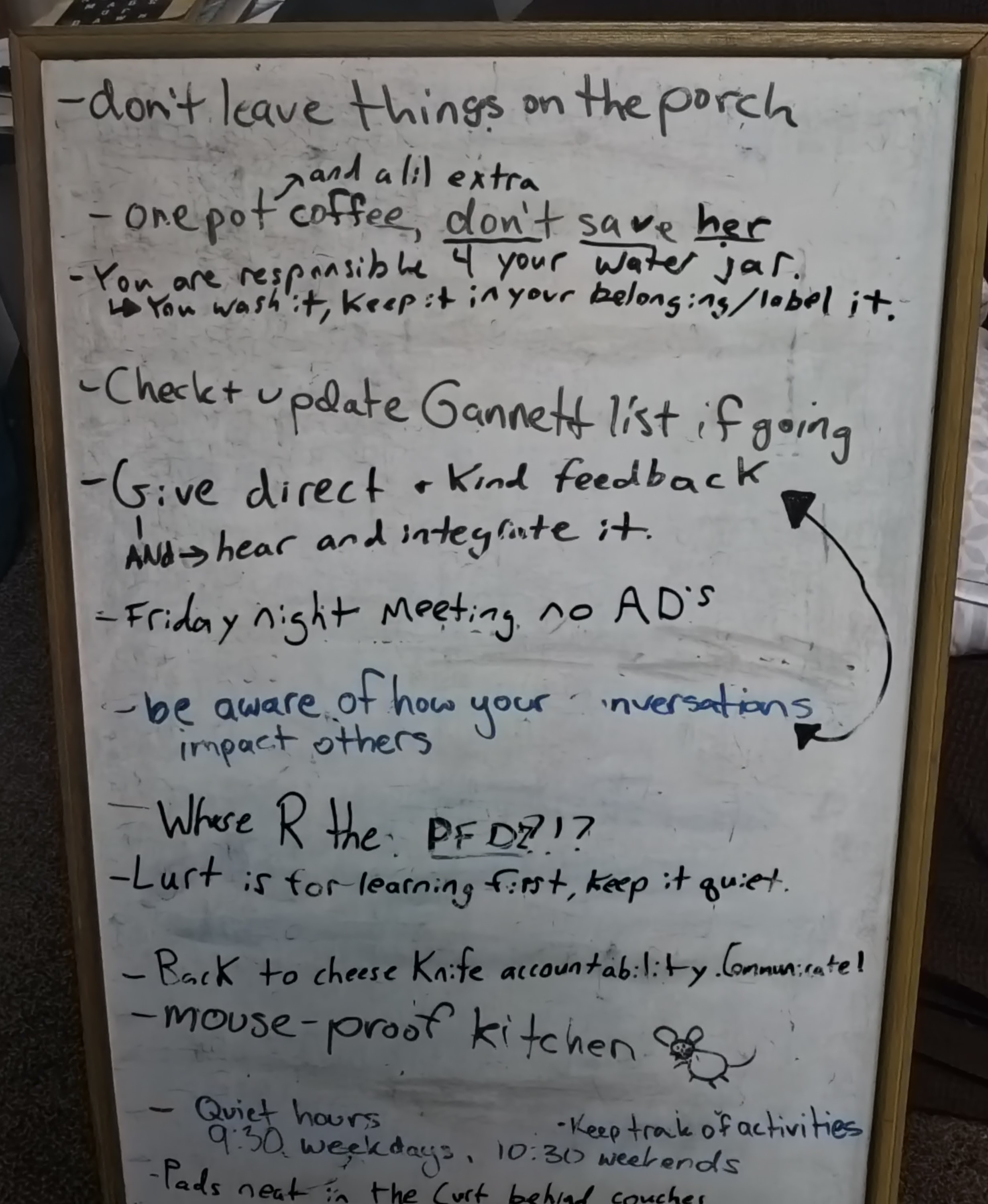 During our community meetings every Wednesday, facilitated by Nate and Eva, our assistant directors, we go over community reminders on a white board to hold each other accountable and keep the space healthy. After chatting with our directors, they emphasized the importance of these meetings to maintain these substantial relationships during this semester. Comparing these some circumstances here in the village to on-campus circumstances, there is a great difference in how we relate and bond with one another. We have the privilege of eating meals with one another every day and taking our classes to another level, getting more personal and interactive with one another in different capacities.