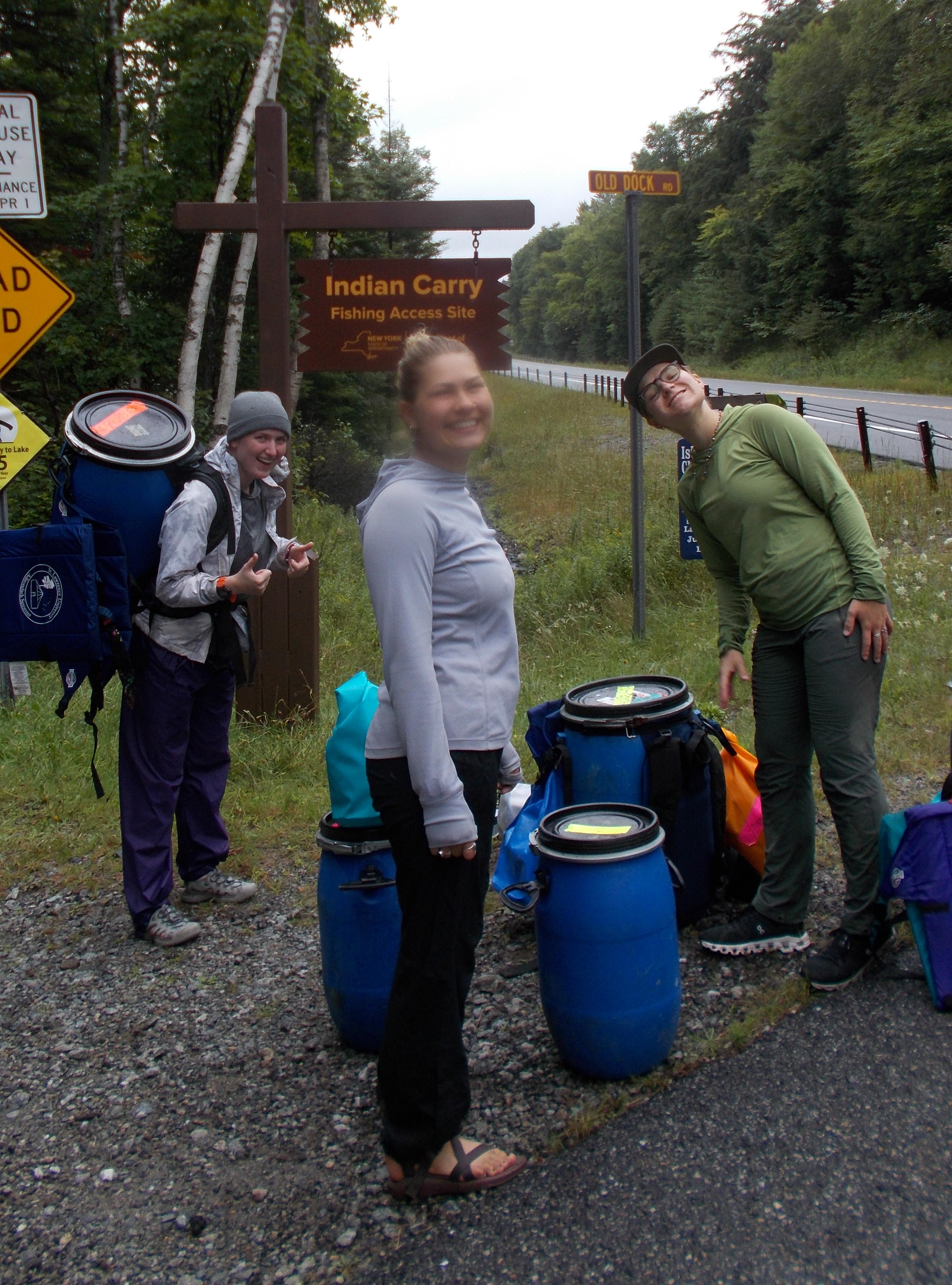 Approaching the dock to our portage, spirits may have been low but anticipation was high. Some of our group members were deemed skillful in the art of a portage, with previous experience that offered space for peer leadership to help the group reach our common goal. Briefly described, a portage (or “carry” in Adirondack vernacular) is when you carry your canoe and gear over a stretch of (mostly) dry land between two bodies of water or around a stretch of rapids. Topography, geography, private property, public access, and other factors determine the placement of portages throughout a given watershed. Portaging is not an easy task, especially when the most convenient way to carry a canoe is upside down and on top of your shoulders. Additionally, each canoe pair had three pickle barrels of gear, personal dry bags, and two paddles that they had to haul together to make an efficient carry. While not an easy feat, we accomplished the portage with strength and thoughtful communication.