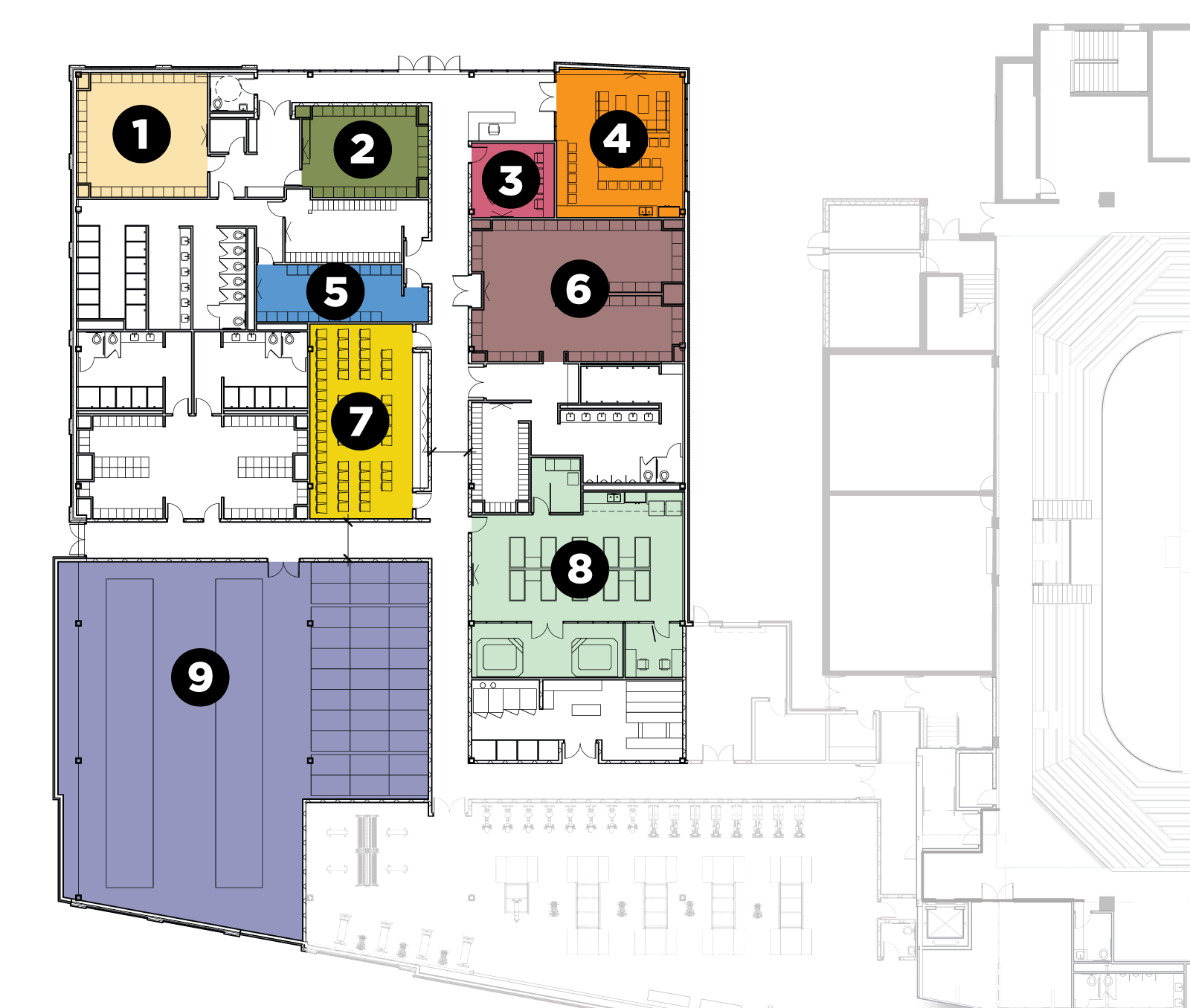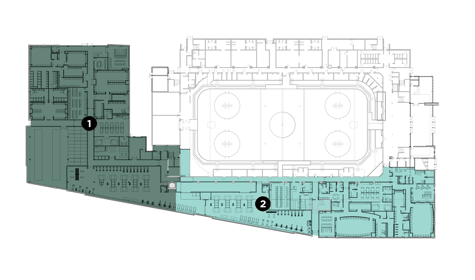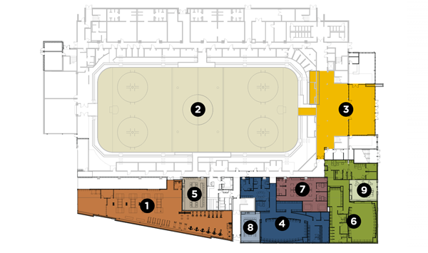 The heart of the renovation, this large area includes men’s and women’s Division-I hockey locker rooms, coaching offices, the training center, media center and more.