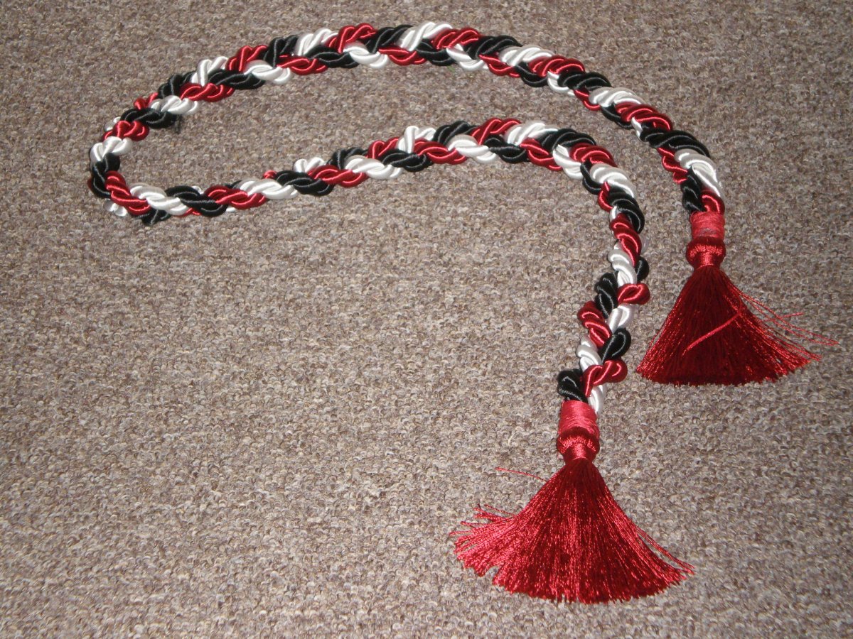 Each year, the honorary cords for graduating senior members of Lambda Alpha are handmade by the junior, sophomore, and first-year members of the anthropology club. The instructions for making these cords have been handed down from class to class for many years. The cords are red, white, and black, representing theories from the 1969 Berlin and Kay color study. These are the colors of anthropology!