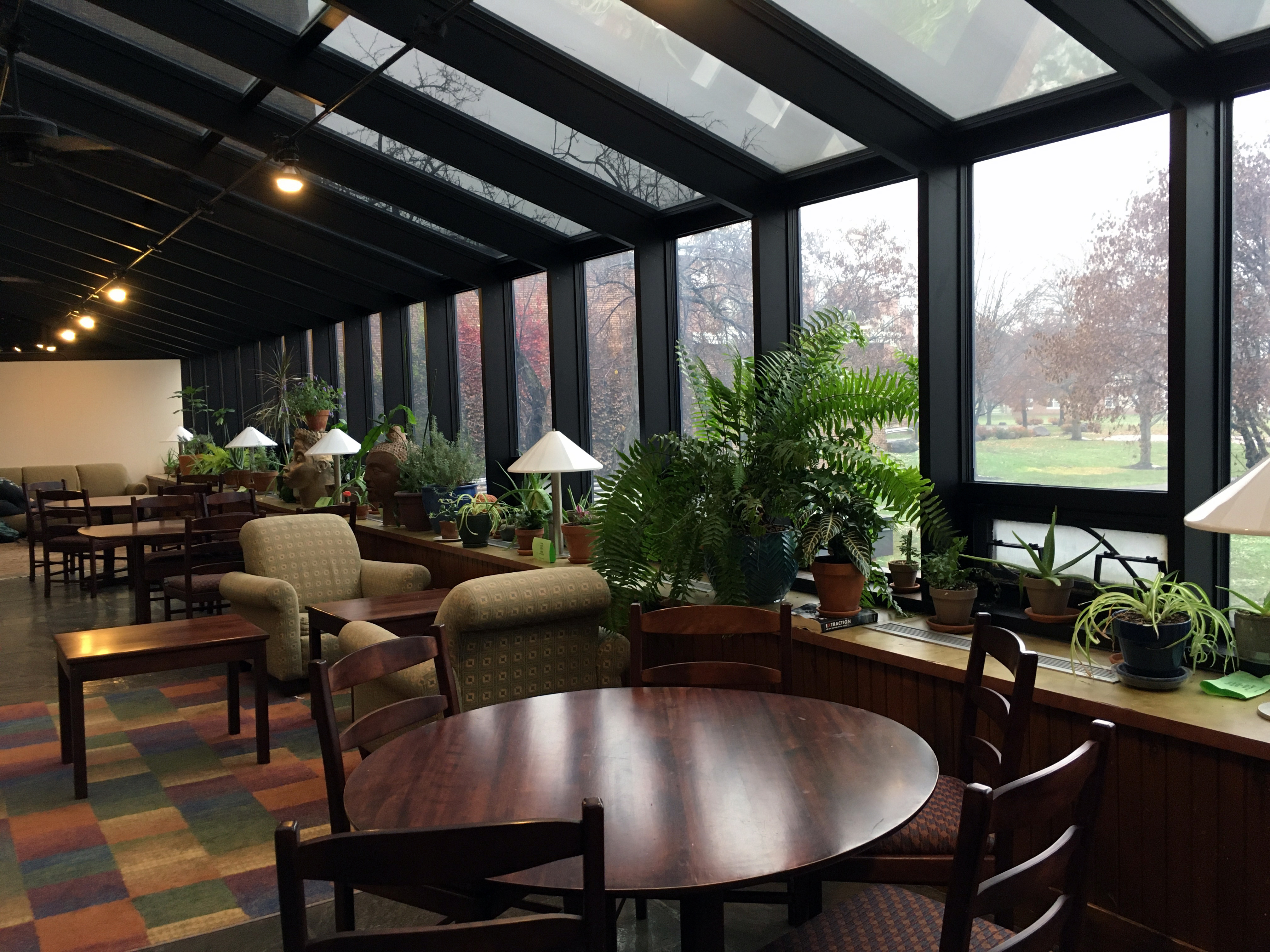 With open glass ceiling and windows and chairs, sofas, and tables the Ireland Student Arts Lounge is a great place to study, unwind, or work on your latest work of art. Because of the open light this area has become an impromptu greenhouse with plants lining the shelves.