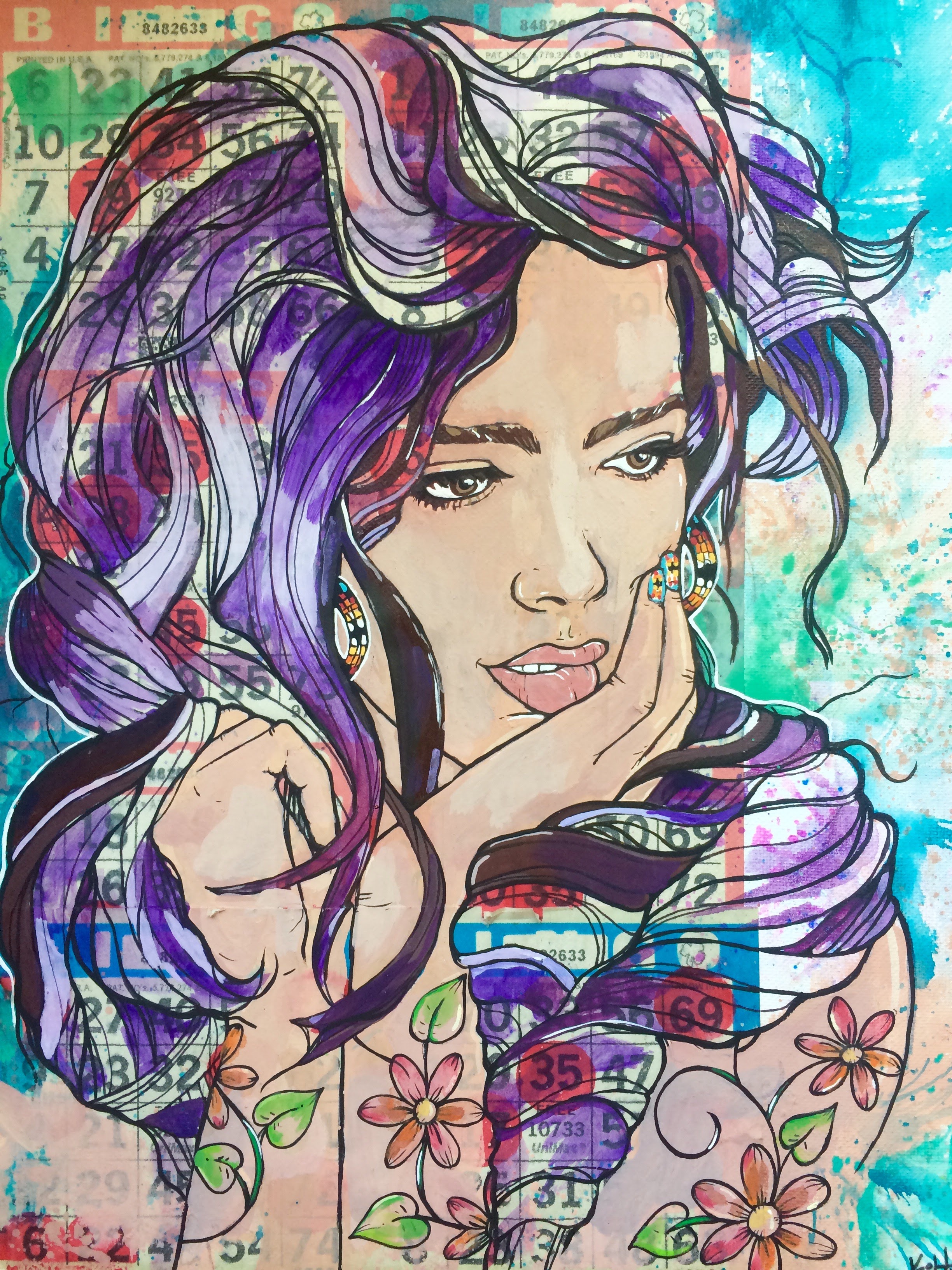 Kit Thomas (they/she) is an internationally exhibiting Two-Spirit Haudenosaunee mixed-media painter. Based in Akwesasne, they create work rooted in memory, ancestry, and spiritual presence. Using bold color and unconventional surfaces like bingo cards, Thomas weaves stories of resilience, identity, and belonging. They are also an advocate for community, healing, and cultural connection, and serve as a Council Member to the Chiefs of Ontario through the Fire Keepers of the Circle.