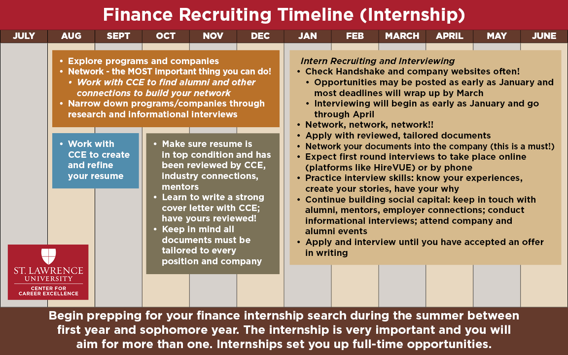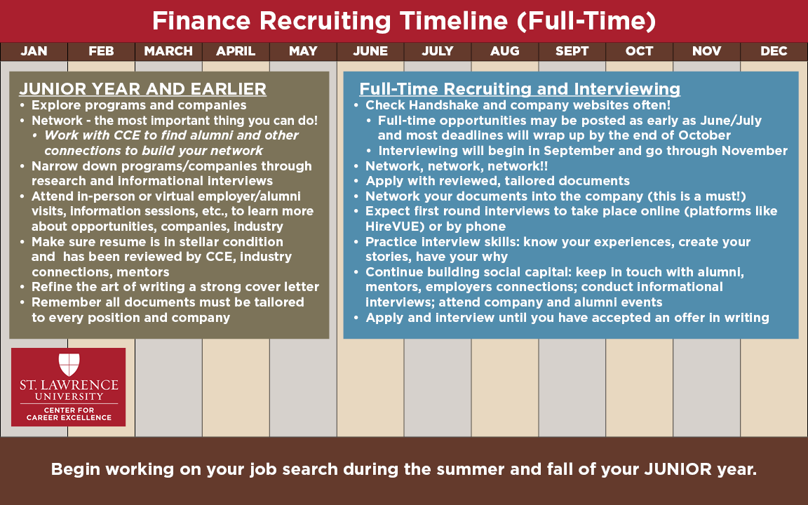 Students interested in pursuing careers in finance need to be aware that companies have very aggressive recruiting timelines for internships and full-time roles. Follow the timelines below to in order to best position yourself for this competitive industry!