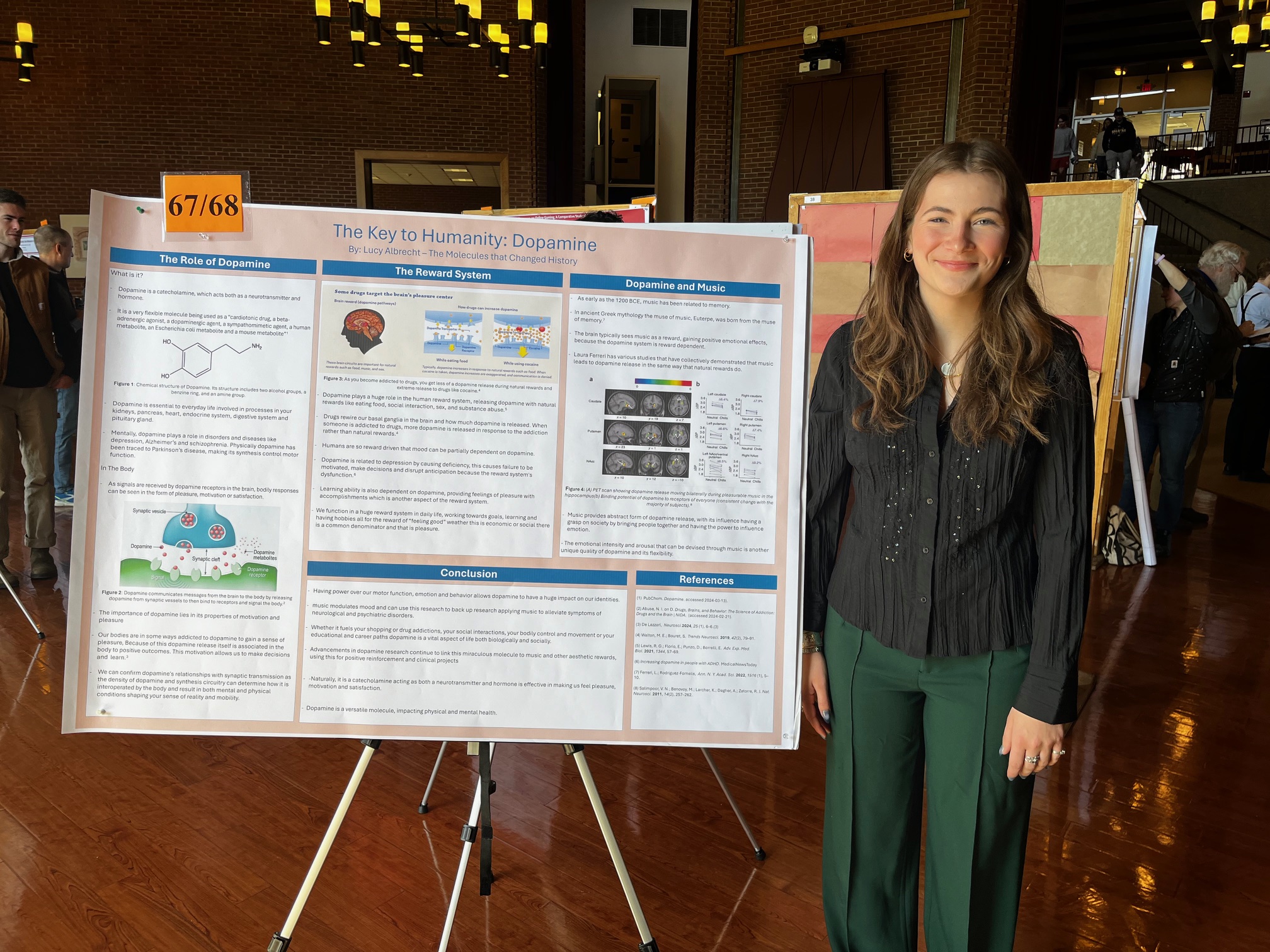 “Abstract: Dopamine is a powerful and versatile molecule with impacts on human life needs and natural urges like fueling our bodies, learning, motivation and pleasure. Unraveling effects of dopamine is vital in being able to treat various health issues and understand human reward systems. Dopamine’s structure as a neurotransmitter and hormone is key to finding its various areas of health impact. Its social presence can be used to find reason behind urges, emotions and addictions. Through dopamine’s concentration or lack thereof in human bodies, it can impair motor functions in patients with Parkinson’s disease, and cognitive function with its role in conditions of Alzheimer’s, ADHD, schizophrenia and depression. Within society it feeds addiction, impairing natural reward systems. Recent research shows that music can activate the dopamine reward system and can be used to have medicinal benefits influencing emotion, arousal and memory.