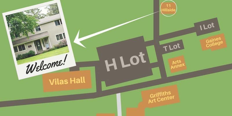 When entering from within campus, one will turn onto Hillside Road, 11 Hillside is the first house/office building on the right. There is a large, gray mailbox near the main entrance. 11 Hillside is directly behind Gaines Residence Hall.