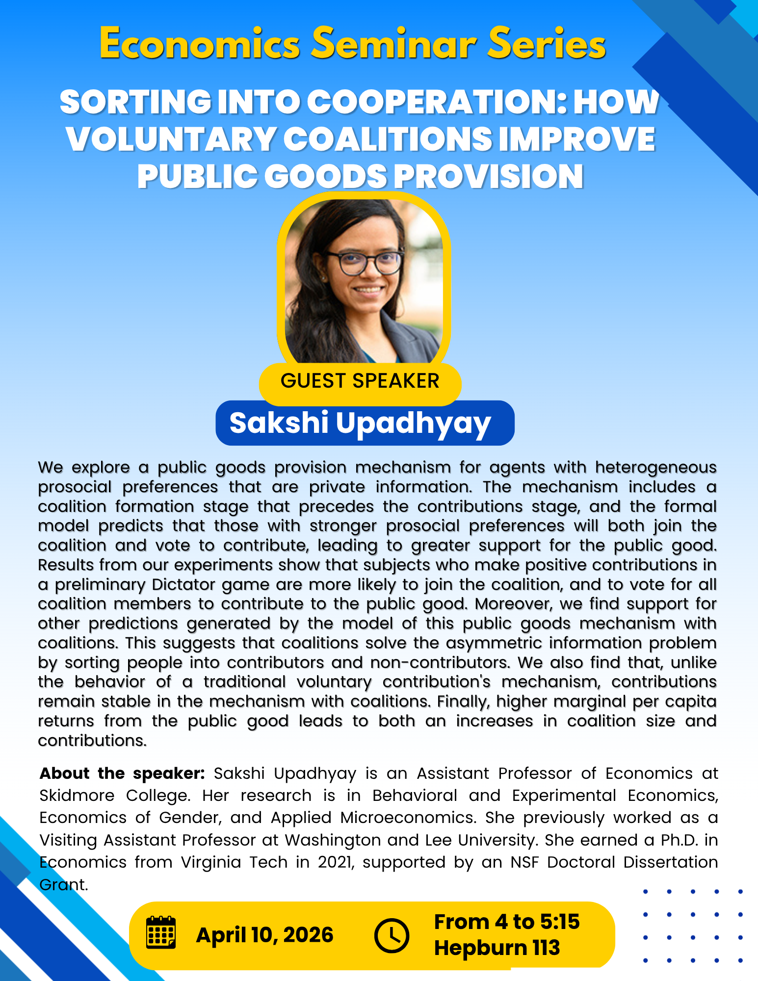 | Sakshi Upadhyay (Skidmore College) | Friday, April 10, 2026 4:00-5:15pm Hepburn 021 | Sorting into Cooperation: How Voluntary Coalitions Improve Public Goods Provision |