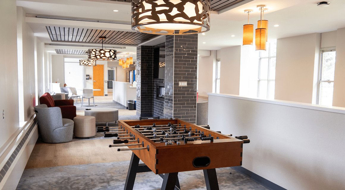 A central lounge, with a fireplace and foosball table, and two kitchens in the building. There are also study lounges in each tower.