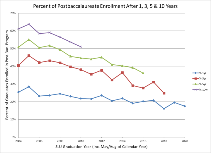 If a student attended more than one school after graduating from St. Lawrence, each school gets counted once. Based on National Student Clearinghouse data for class years of 2001-2005.