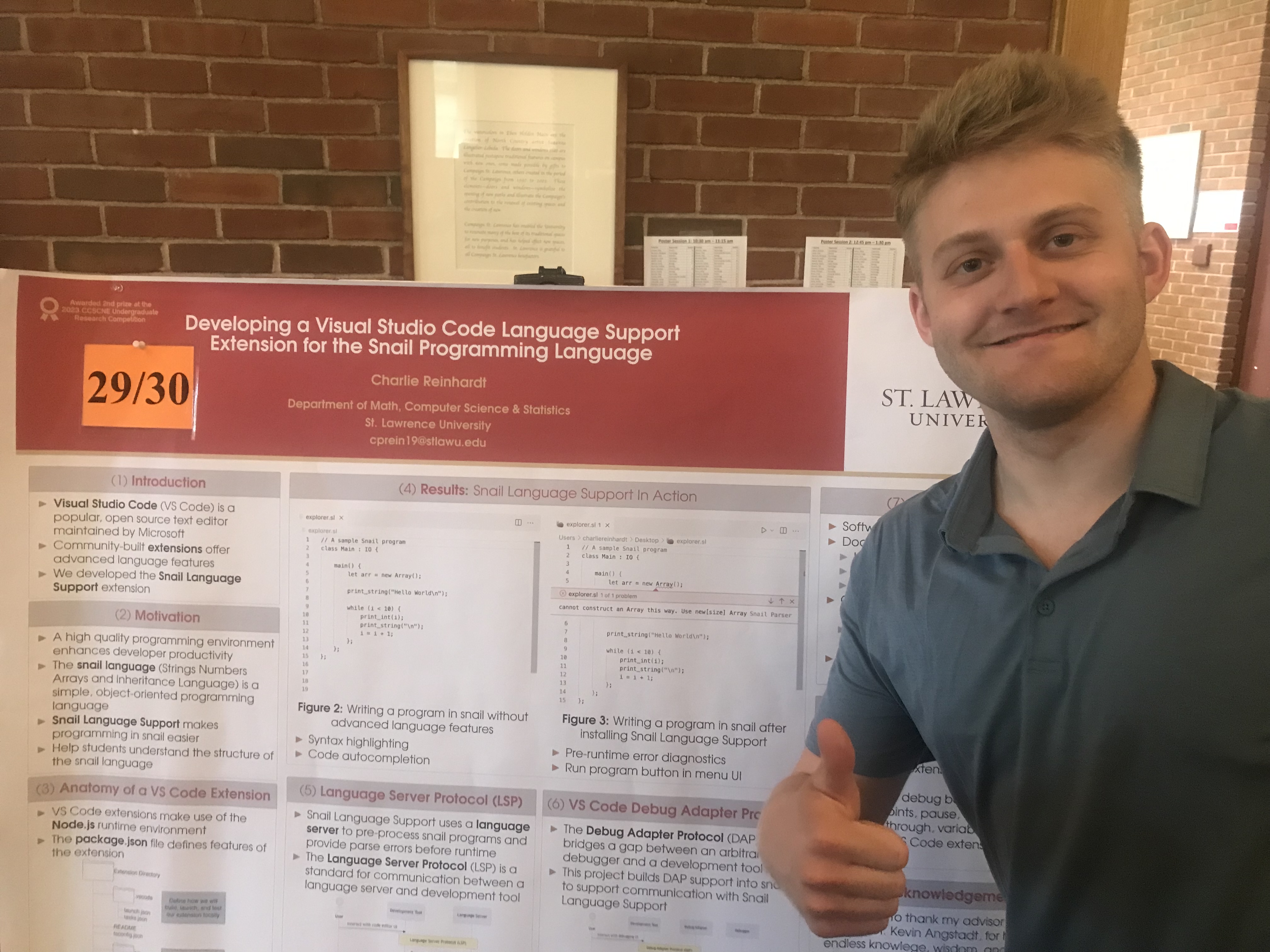 Abstract: A high quality programming environment (often an Integrated development environment or IDE) can be vital to enhancing developer productivity. Visual Studio Code (VS Code) is a popular, open-source text editor maintained by Microsoft [2]. VS Code delivers language-specific features through freely downloadable, community-built extensions on an online marketplace. Many of these extensions allow developers to take advantage of editing features such as syntax highlighting, code-autocompletion, or debugging support. The snail language (Strings Numbers Arrays and Inheritance Language) is a simple, object-oriented programming language meant to be implemented in a one-semester undergraduate course [1]. I present my experience in developing a VS Code extension to provide language support for the snail language. The extension implements support for syntax highlighting, rudimentary auto-completion, and dynamic error-checking diagnostics using VS Code’s Language Server Protocol (LSP) [3]. First, I give an overview of the contents of a VS Code extension. Next, I walk through how a VS Code extension runs, particularly highlighting the functions of VS Code’s Language Server Protocol. I will also discuss how this extension can be further developed to make use of VS Code's Debug Adapter Protocol to implement a debugger that supports breakpoints, start and stop behavior, and variable inspection [4]. Then, I discuss good software development practices including version control and documentation. Finally, I investigate the process of publishing a VS Code extension on the public extension marketplace.