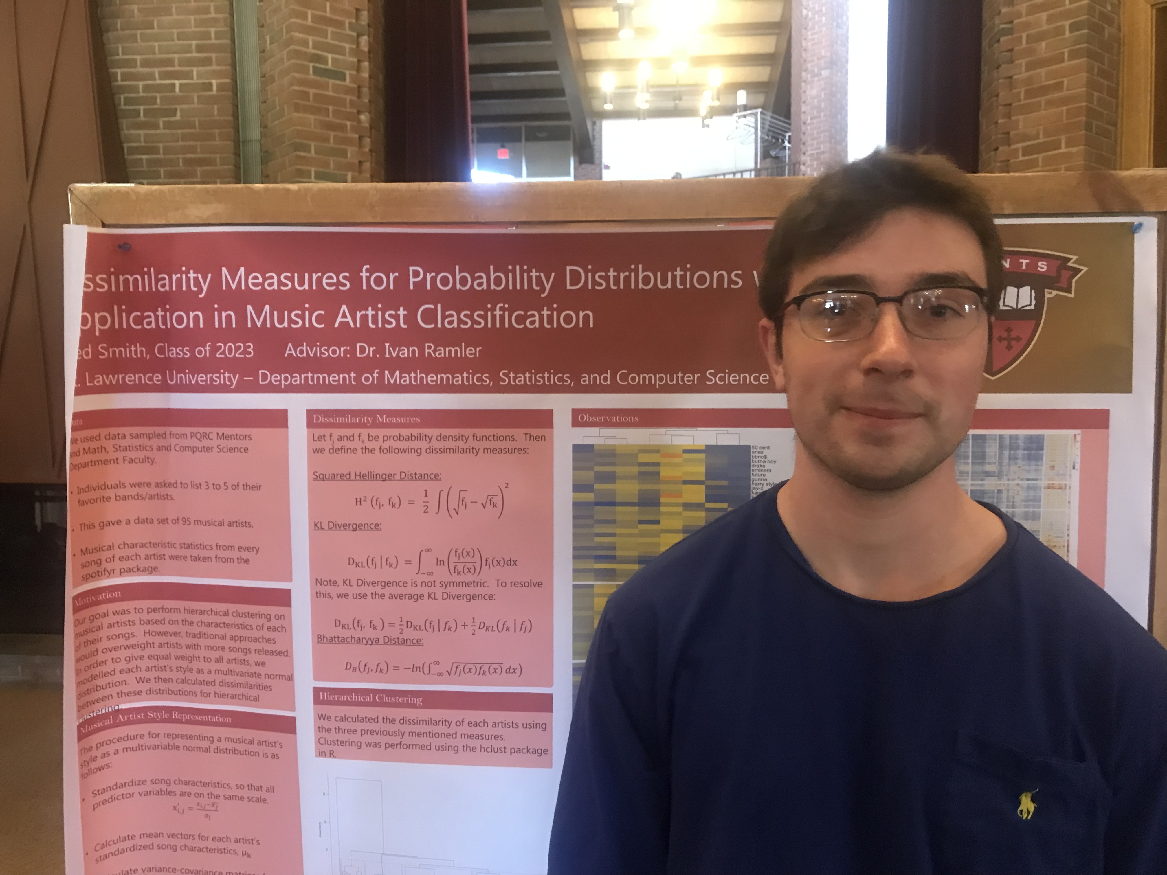 Abstract: In this project, we explore methods of measuring dissimilarity between probability distributions, with an application to music data. We use multivariate normal distributions to represent musical artist’s style and calculate dissimilarity between artist’s style for the purpose of hierarchical clustering. The metrics we explore in this project are the Euclidean distance, Bhattacharyya Distance, K-L Divergence and Hellinger Squared distance. When applied to the music data, the Hellinger Squared and Bhattacharya Distances performed similarly, and the K-L Divergence gave less desirable results.