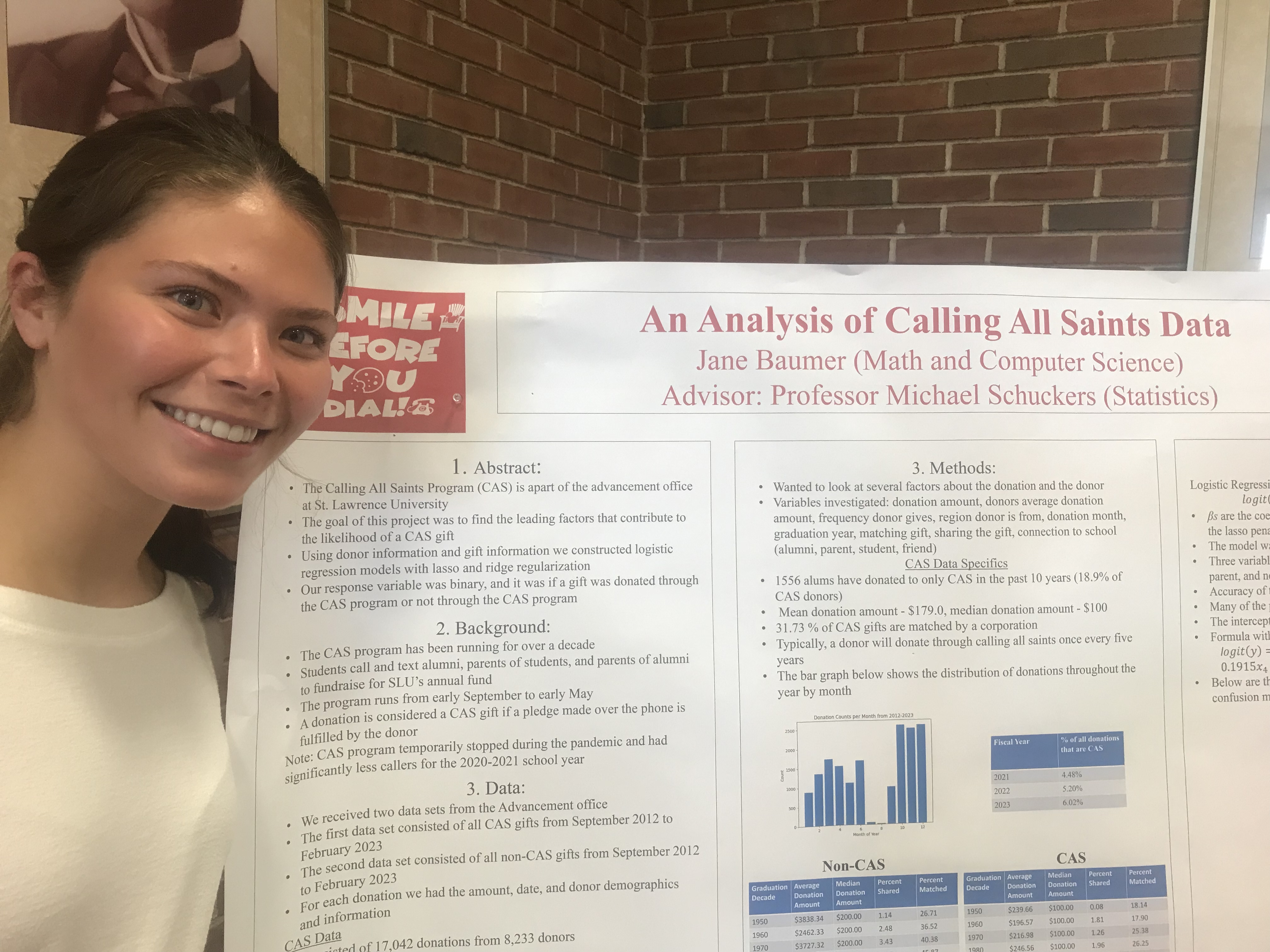 Abstract: The Calling All Saints Program has been fundraising for the St. Lawrence University annual fund for over a decade. This project constructs statistical models to look at the leading factors that contribute to the likelihood of a donation through the Calling All Saints (CAS) program. Utilizing data from the past ten years, we looked at all CAS and non-CAS gifts. We fit logistic regression and lasso regression models to explain trends and predict outcomes. The goal of the analysis is to use statistical methods to provide evidence for strategic improvements in outreach for the Calling All Saints program, and to influence the program beneficially.